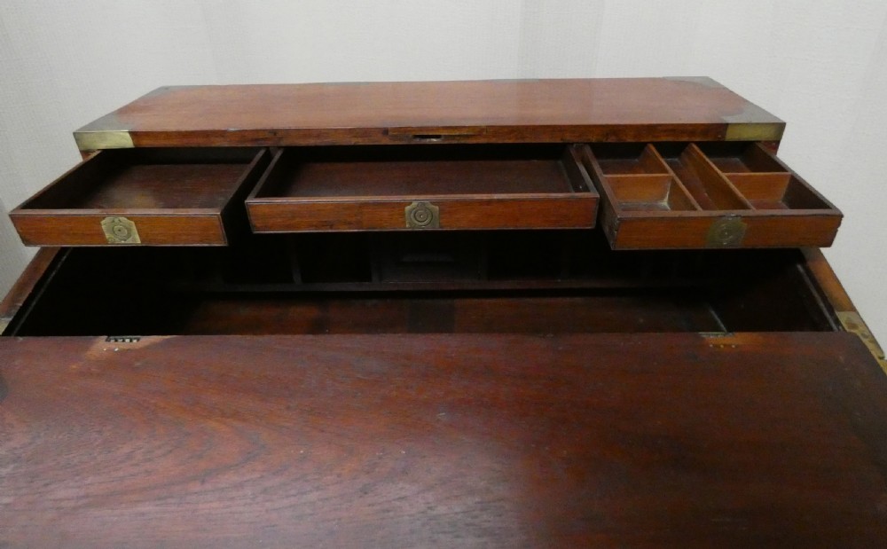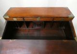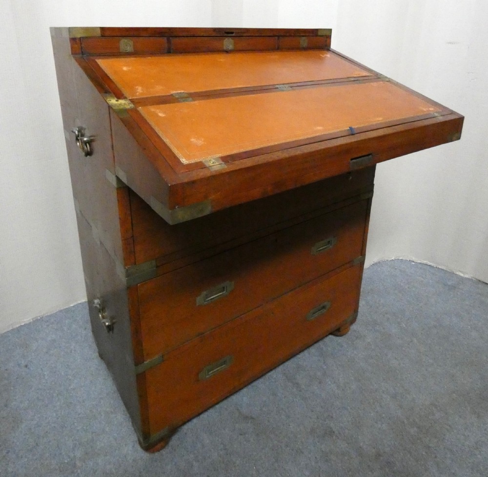 An unusual brass bound, two section, teak secretaire campaign chest.