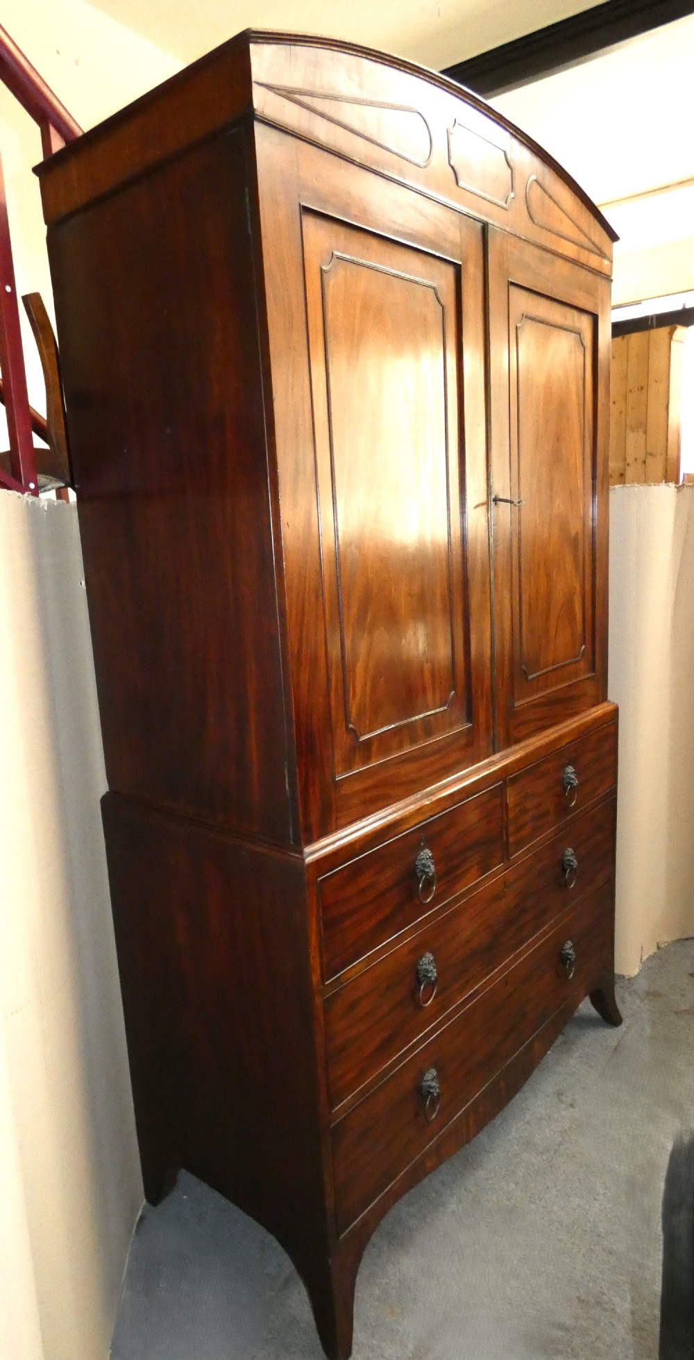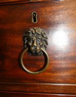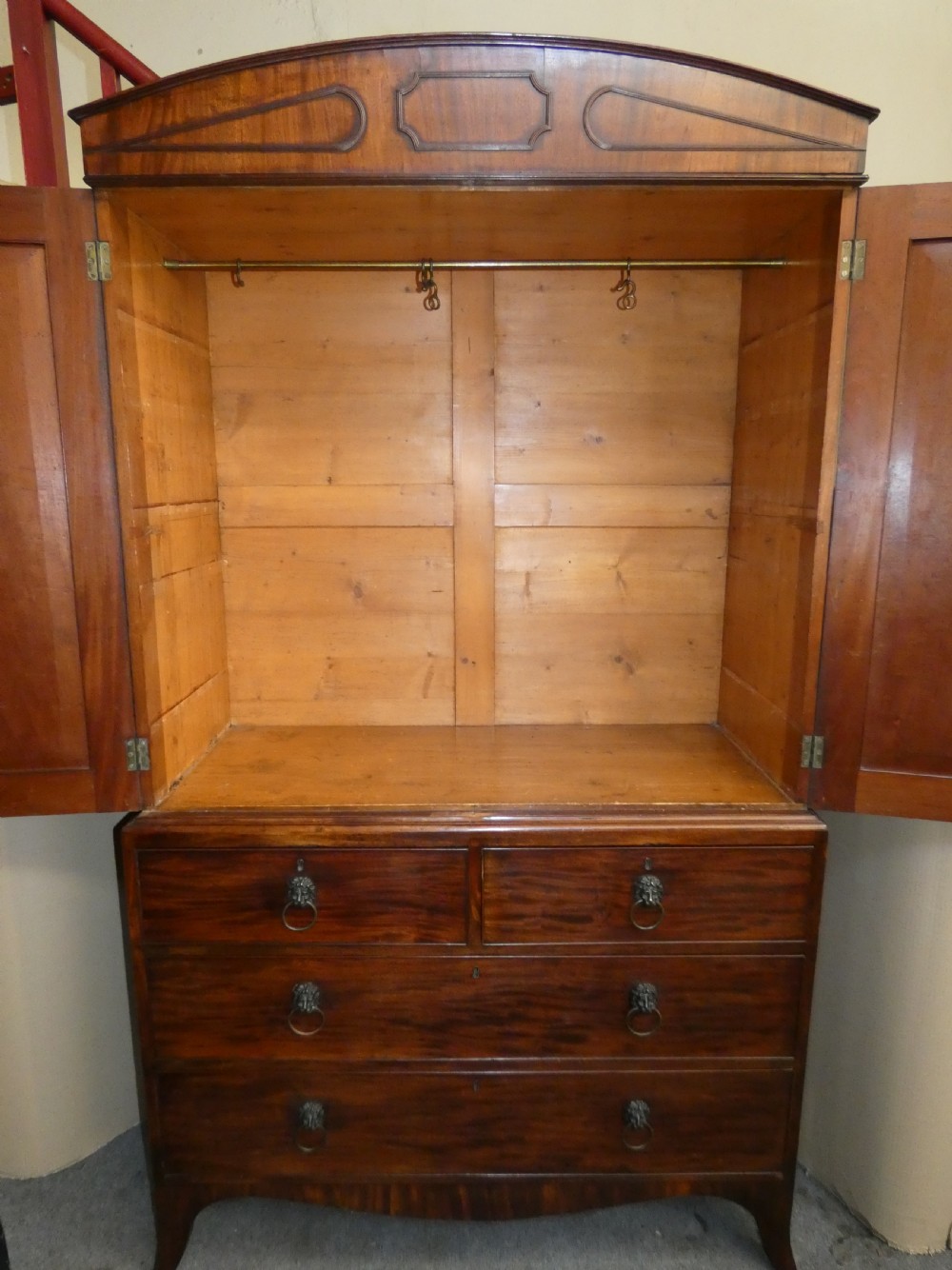 The shaped cornice with moulded decorations over two panelled doors opening to interior fitted with a brass hanging rail. The base with two short drawers and two long drawers, all with fabulous lion mask handles, shaped apron and raised on splay feet.