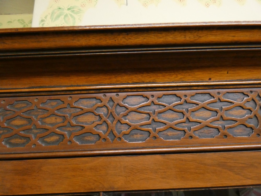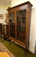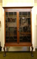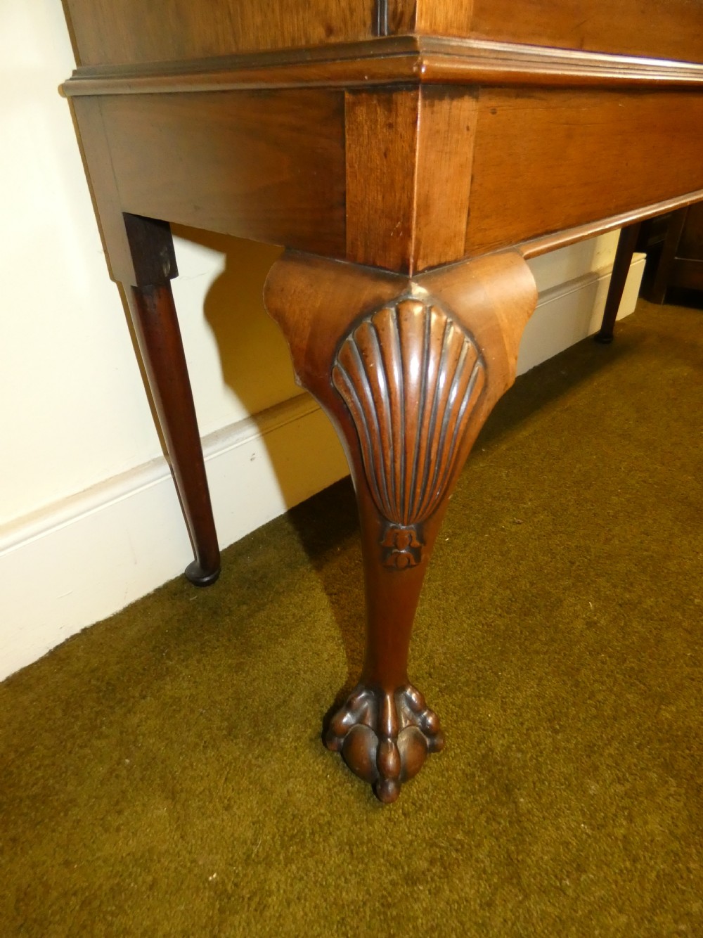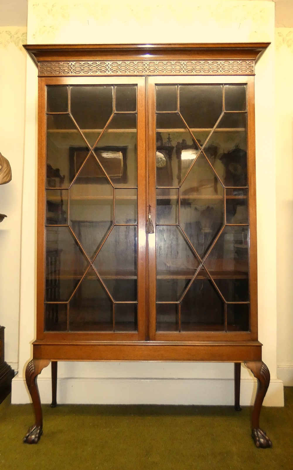 This elegant bookcase has a flared cornice with blind fret detail to the frieze, a pair of astragal glazed doors opening to an interior with adjustable shelves, raised on cabriole legs with carved shell details and substantial ball and claw feet.