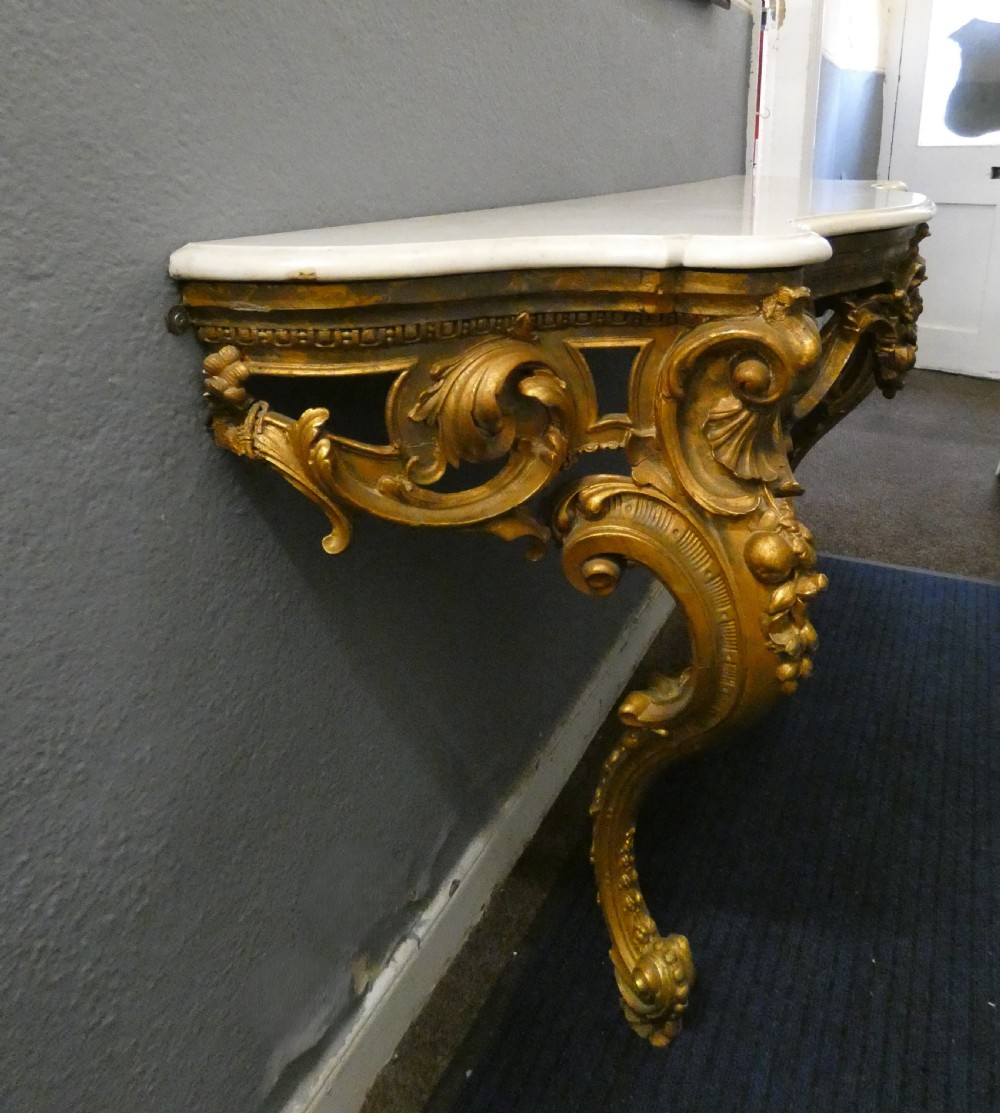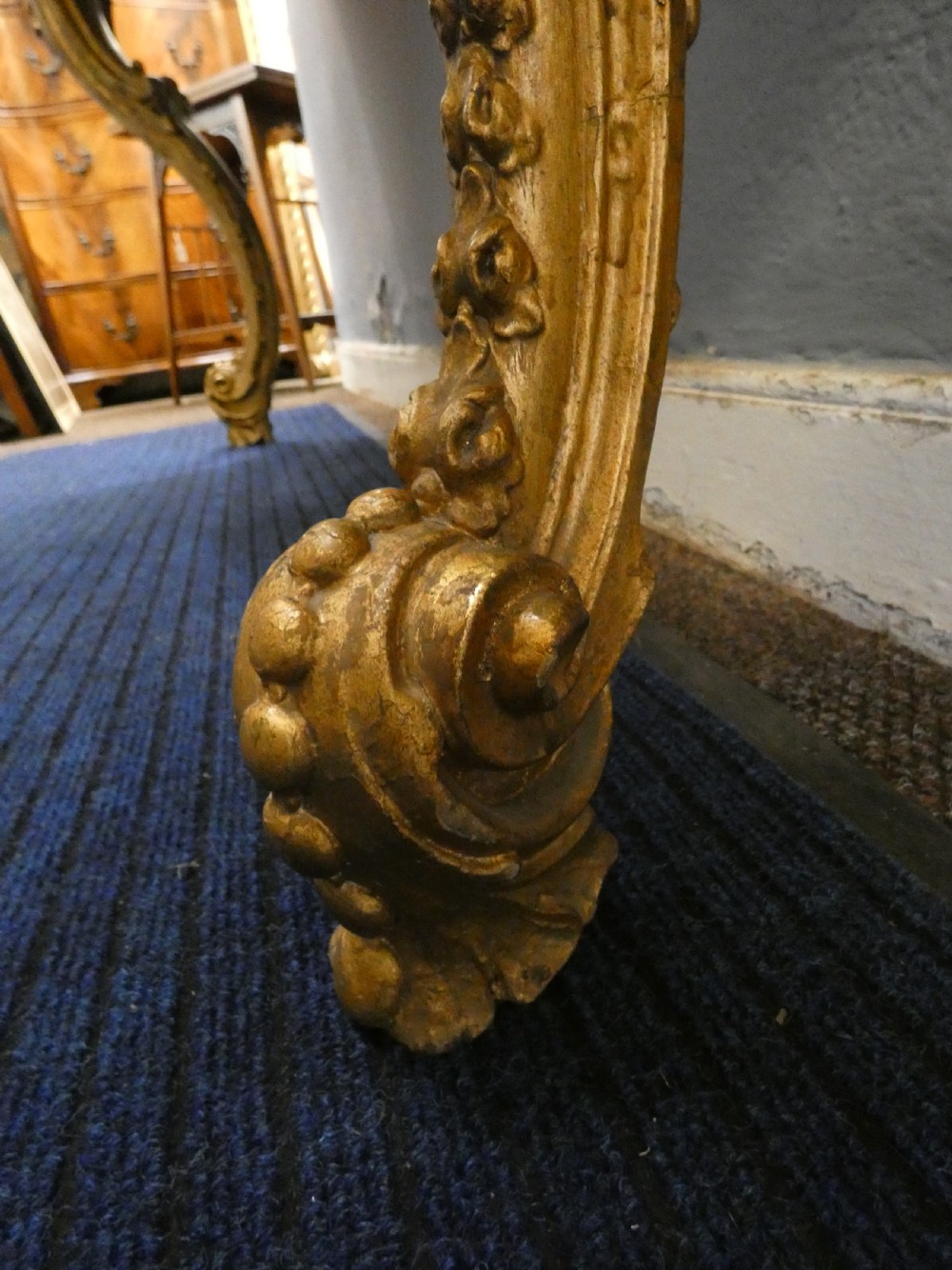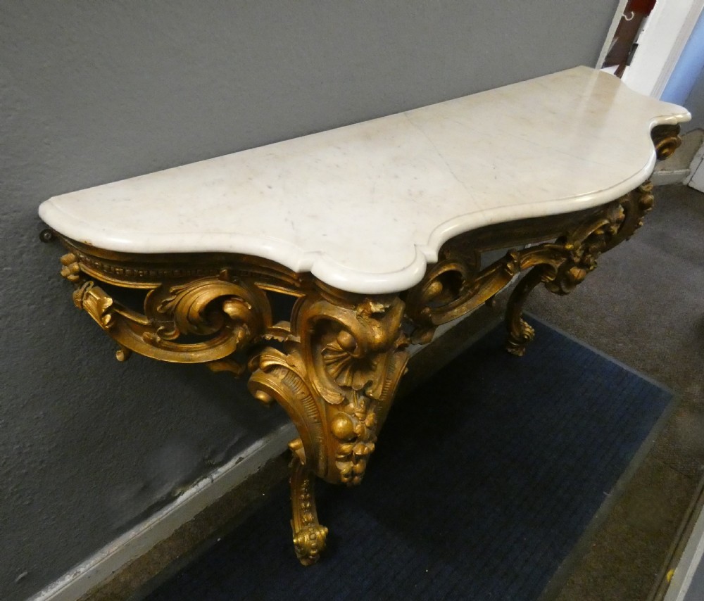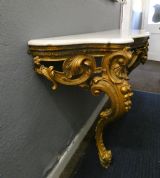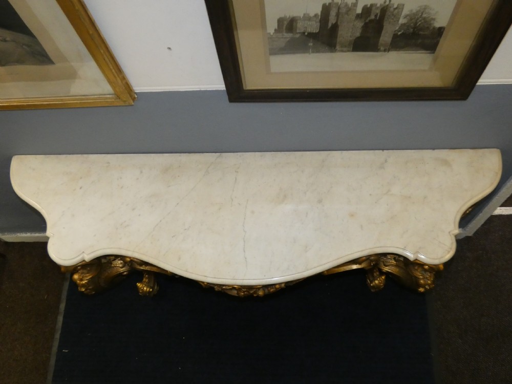 Very elegant large giltwood wall mounted console table with grey veined marble top, decorative carved pierced frieze and raised on substantial carved cabriole legs terminating in knurled feet.