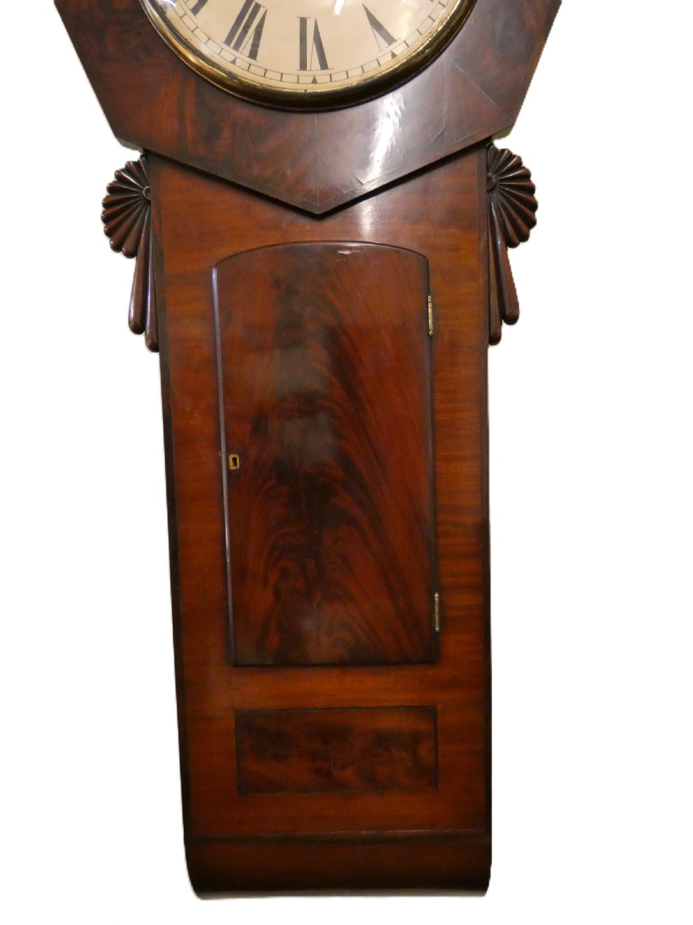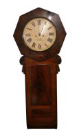 This handsome clock in wonderful flame mahogany has a 14" painted dial in an octagonal surround, the eight day movement strikes the hour on a gong.