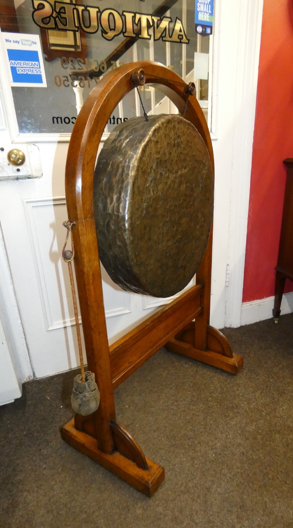Large floor standing dinner gong with striker in an oak frame with decorative hammered brass gong which has a very resonant sound when struck.