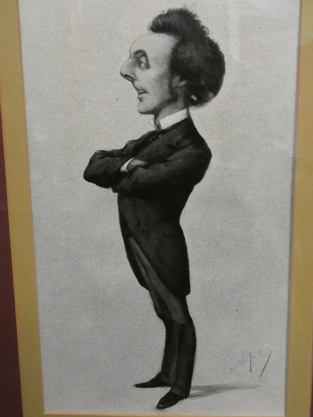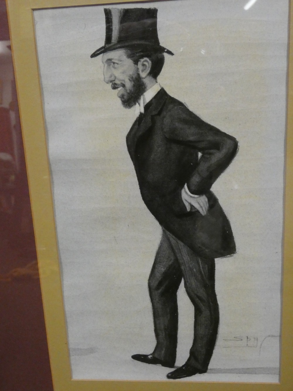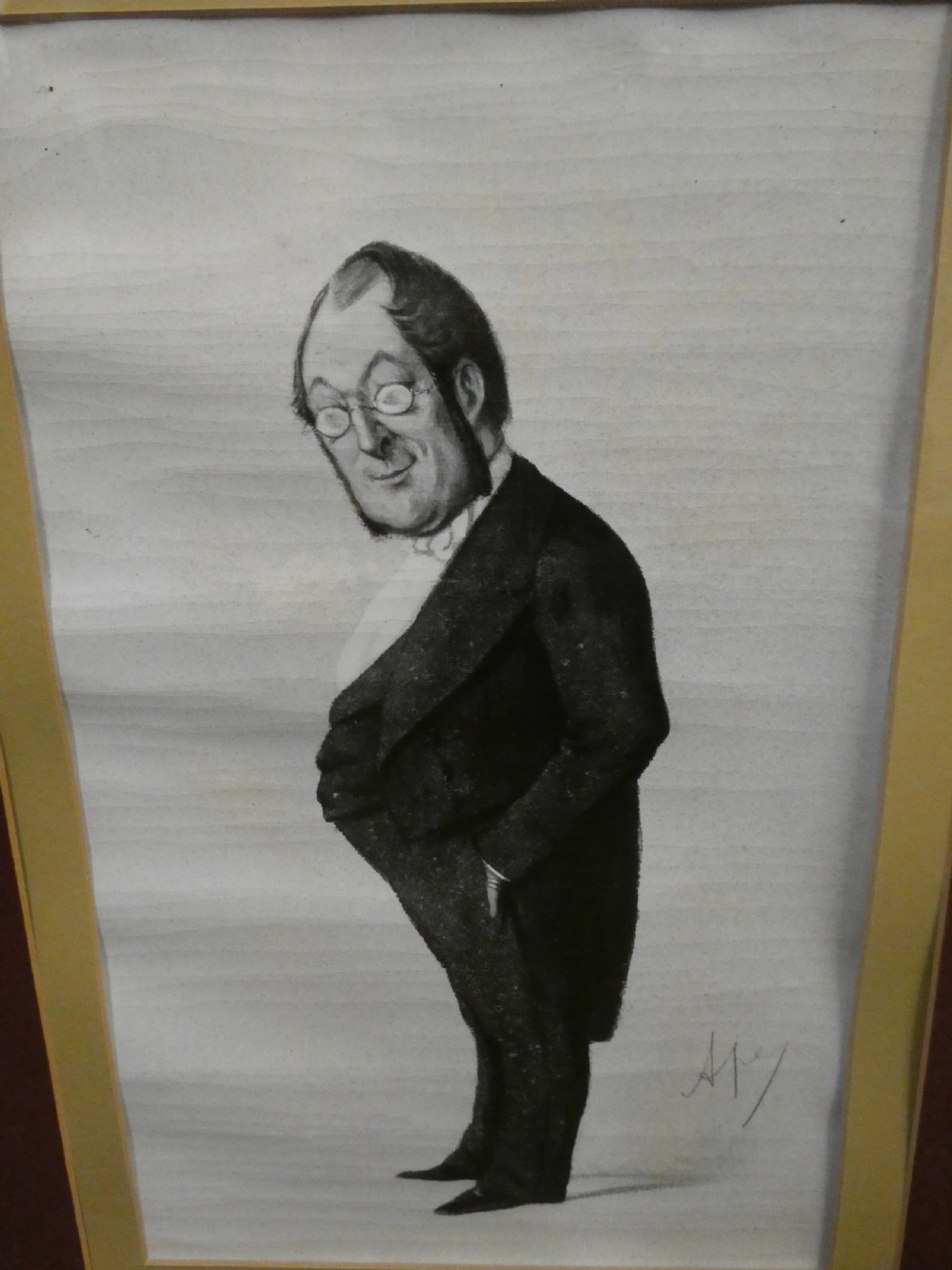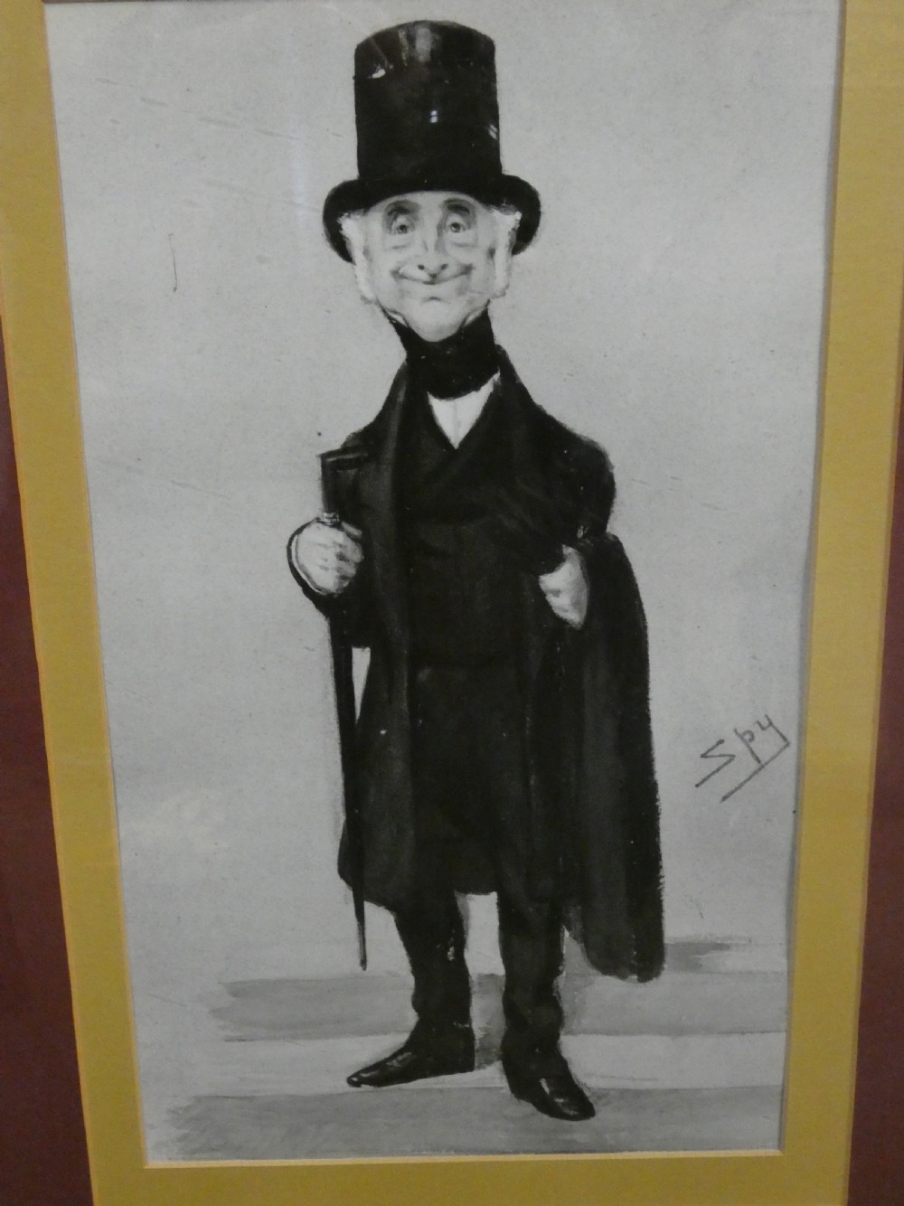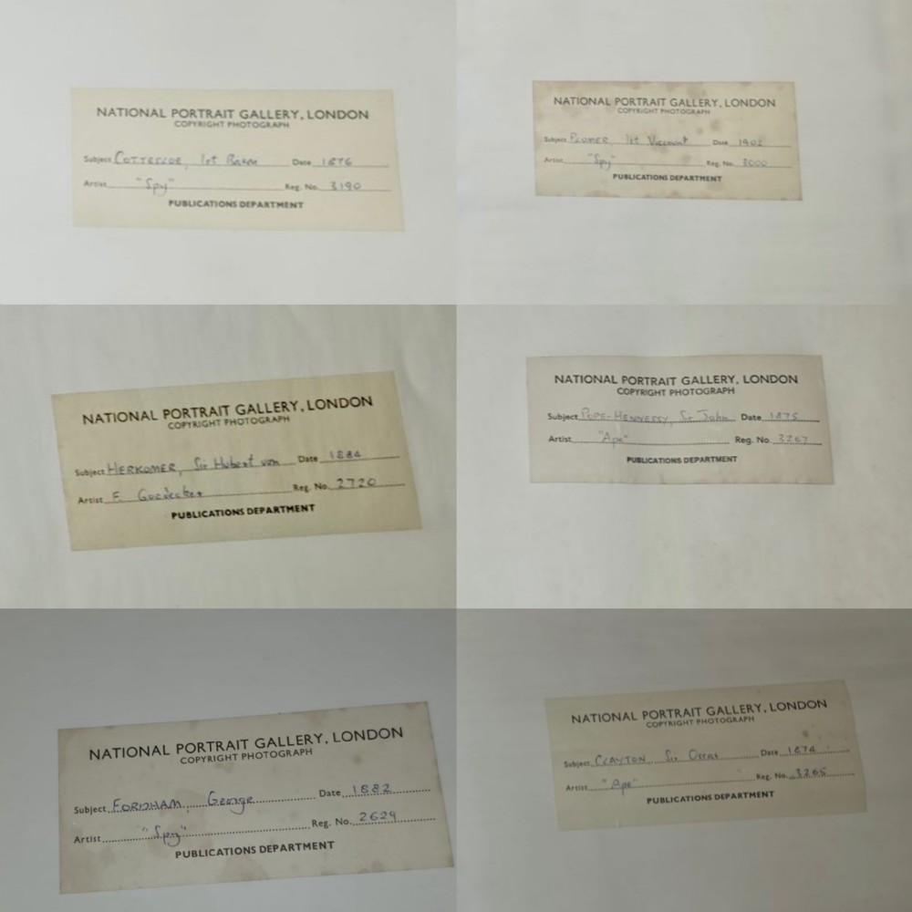 Set of 12 Vanity Fair "Spy" prints by various artists :- Leslie Ward - "Spy", Carlo Pellegrini - "Ape", F Goedecker, Max Beerbohm, Francois Verheyden , mounted and framed in black frames, the back of each print bearing a National Portrait Gallery London Copyright label showing the artist, subject, date and original reg no. ( 6 frames with 2 prints in each ) .