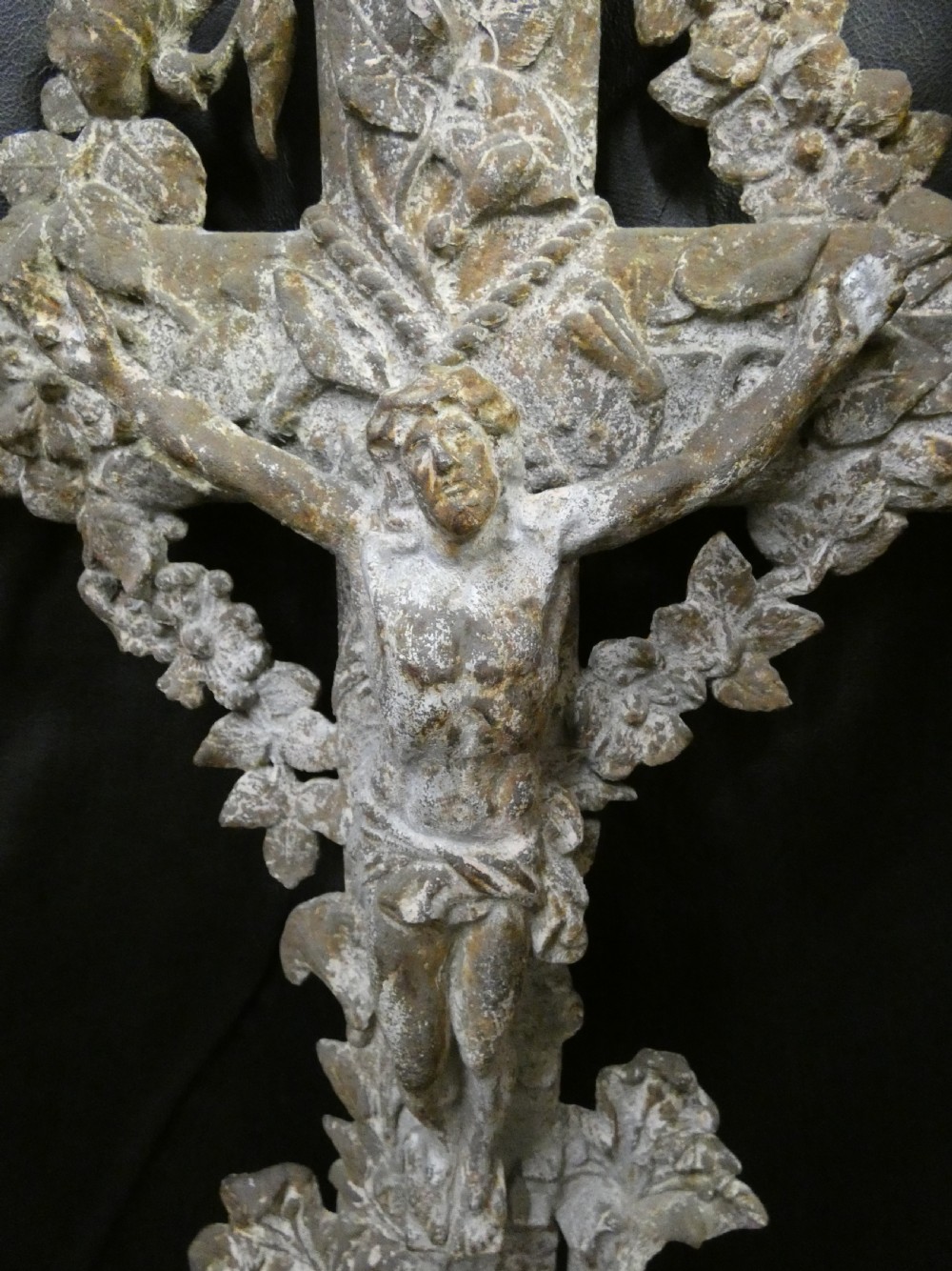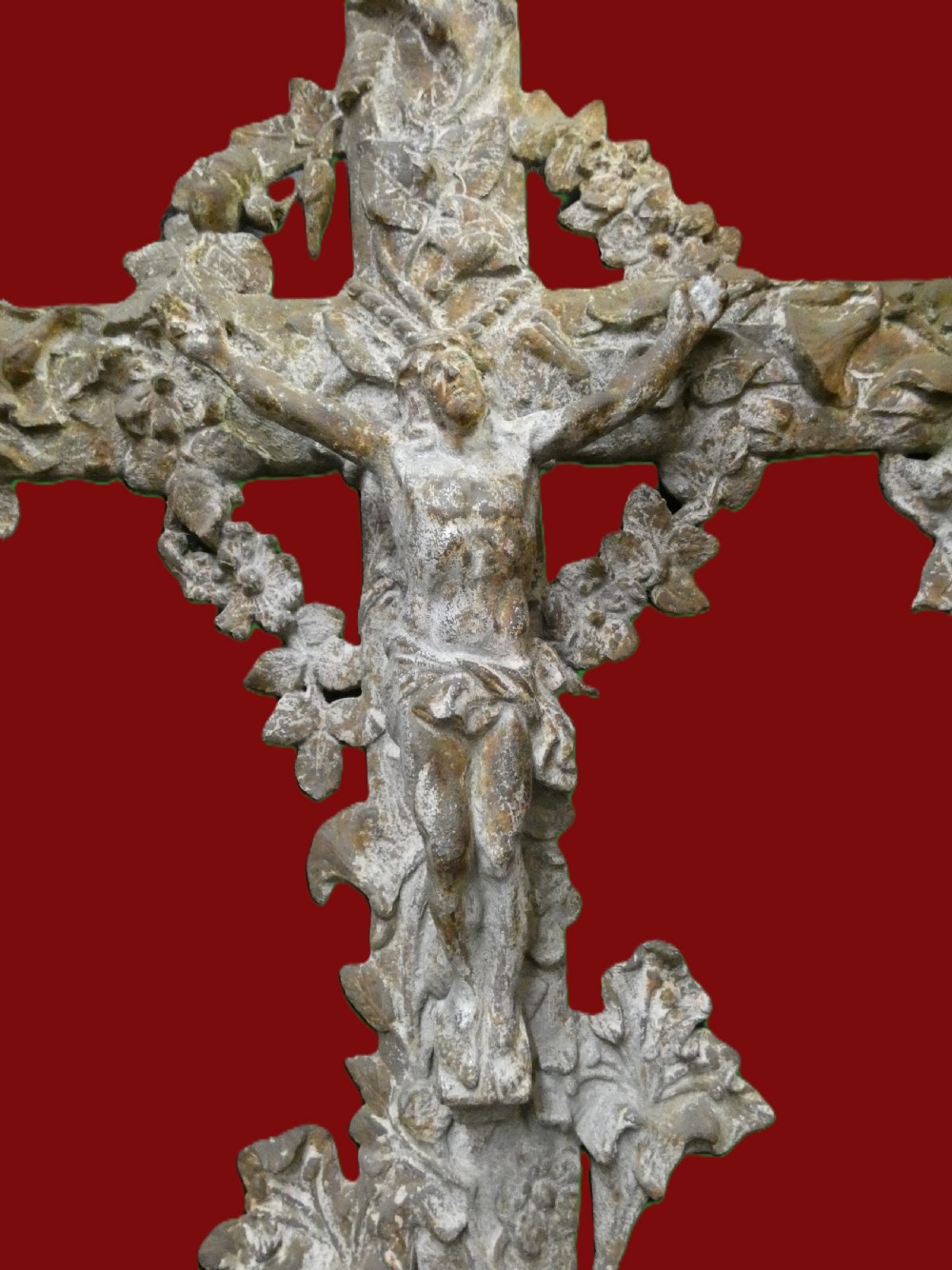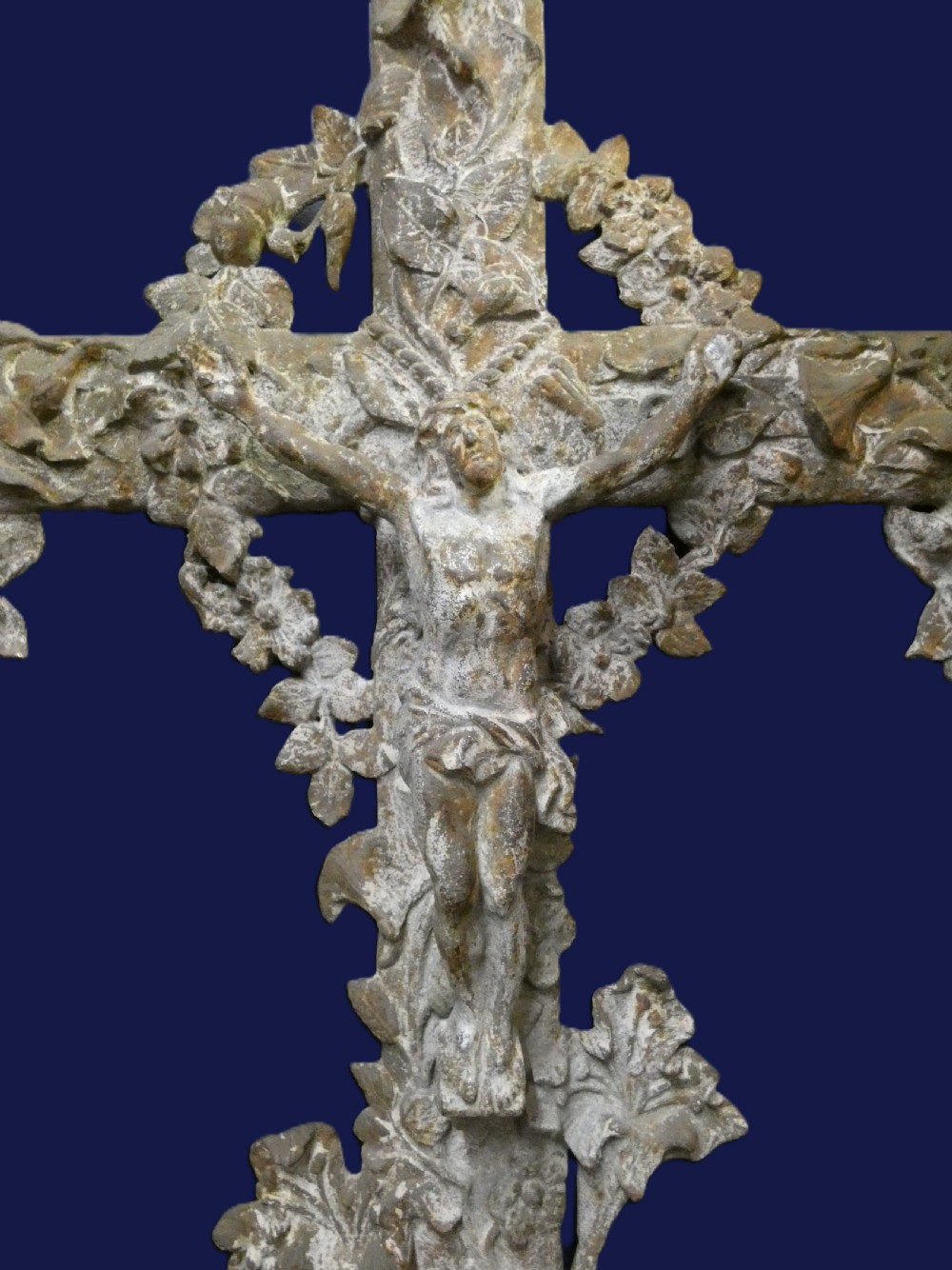 Fabulous early 19th century large cast iron grave marker ( probably French or Belgian ) in the form of a Crucifix with ornate floral and leaf decorations.