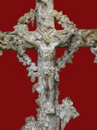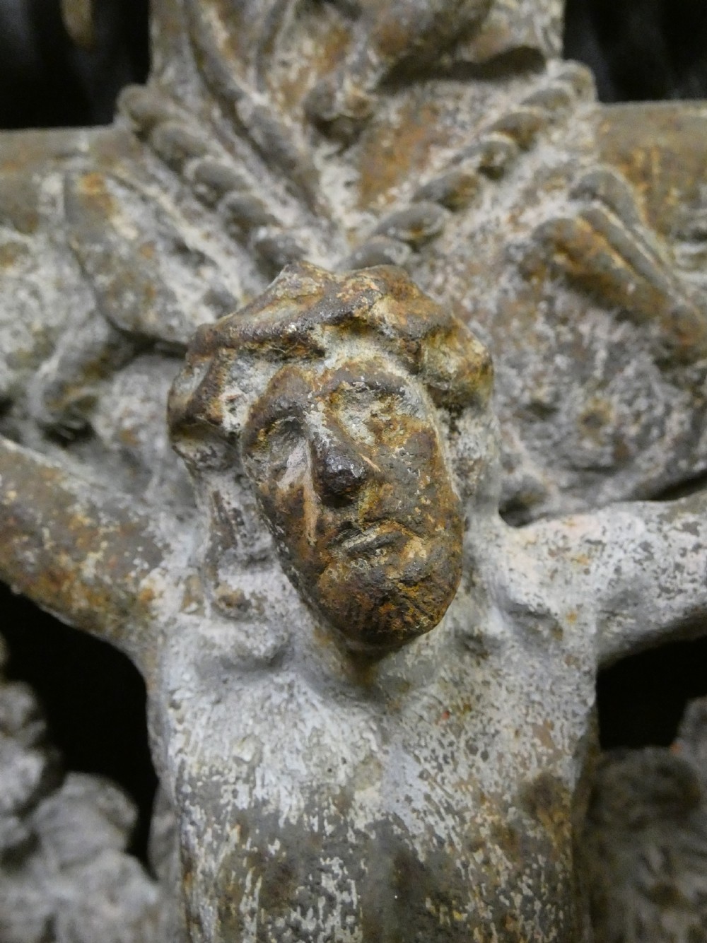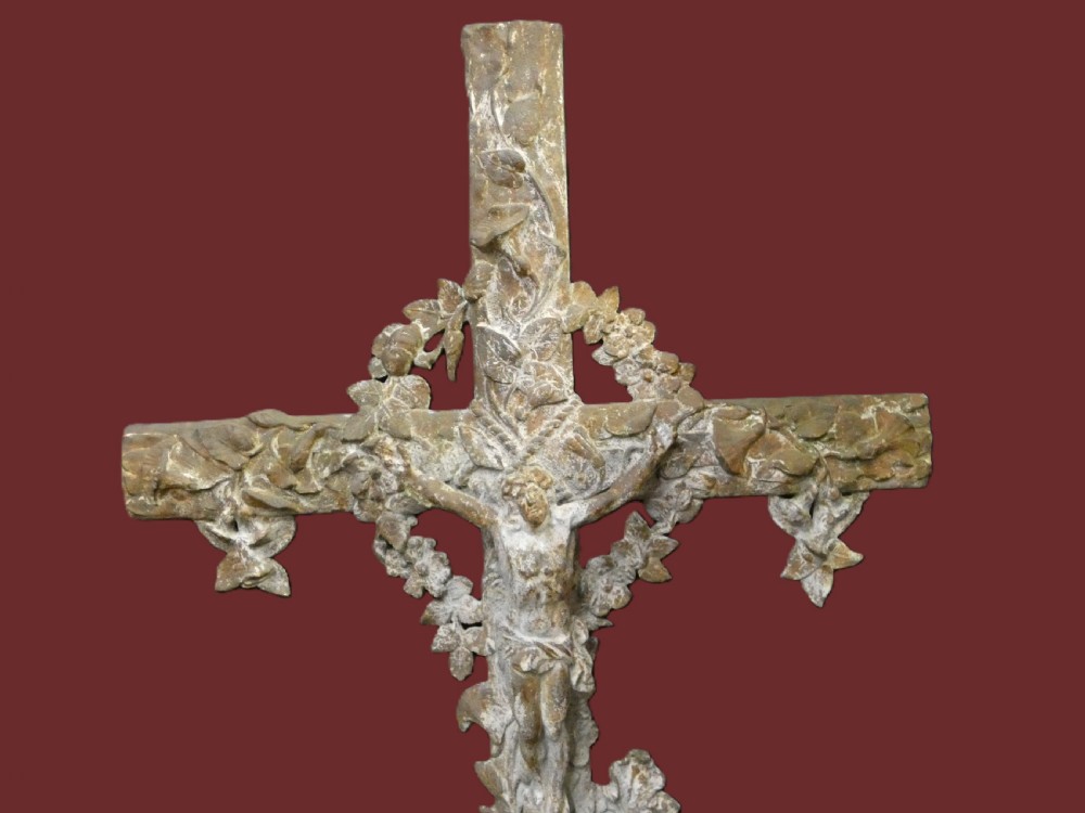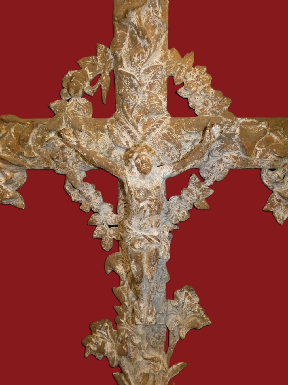 Fabulous early 19th century large cast iron grave marker ( probably French or Belgian ) in the form of a Crucifix with ornate floral and leaf decorations.