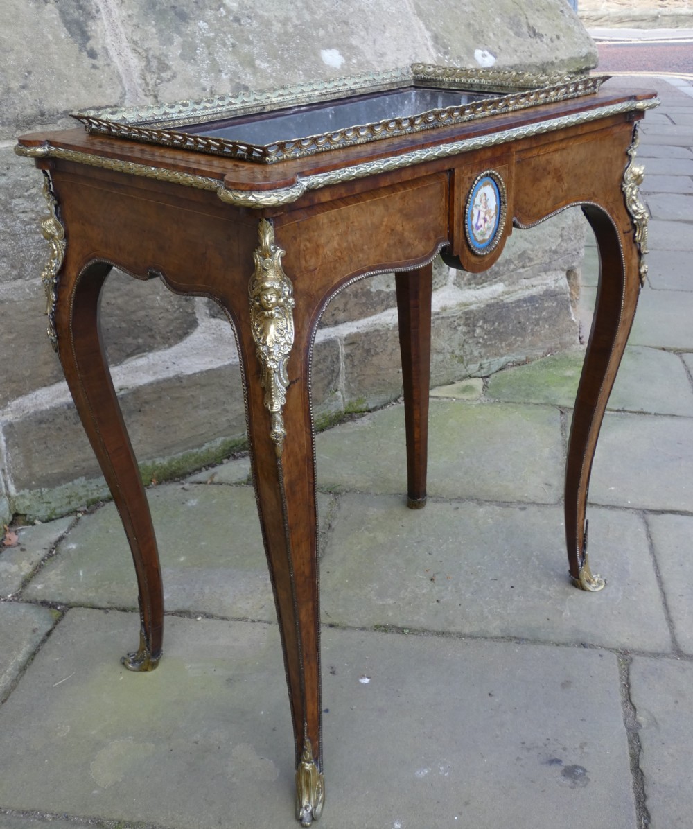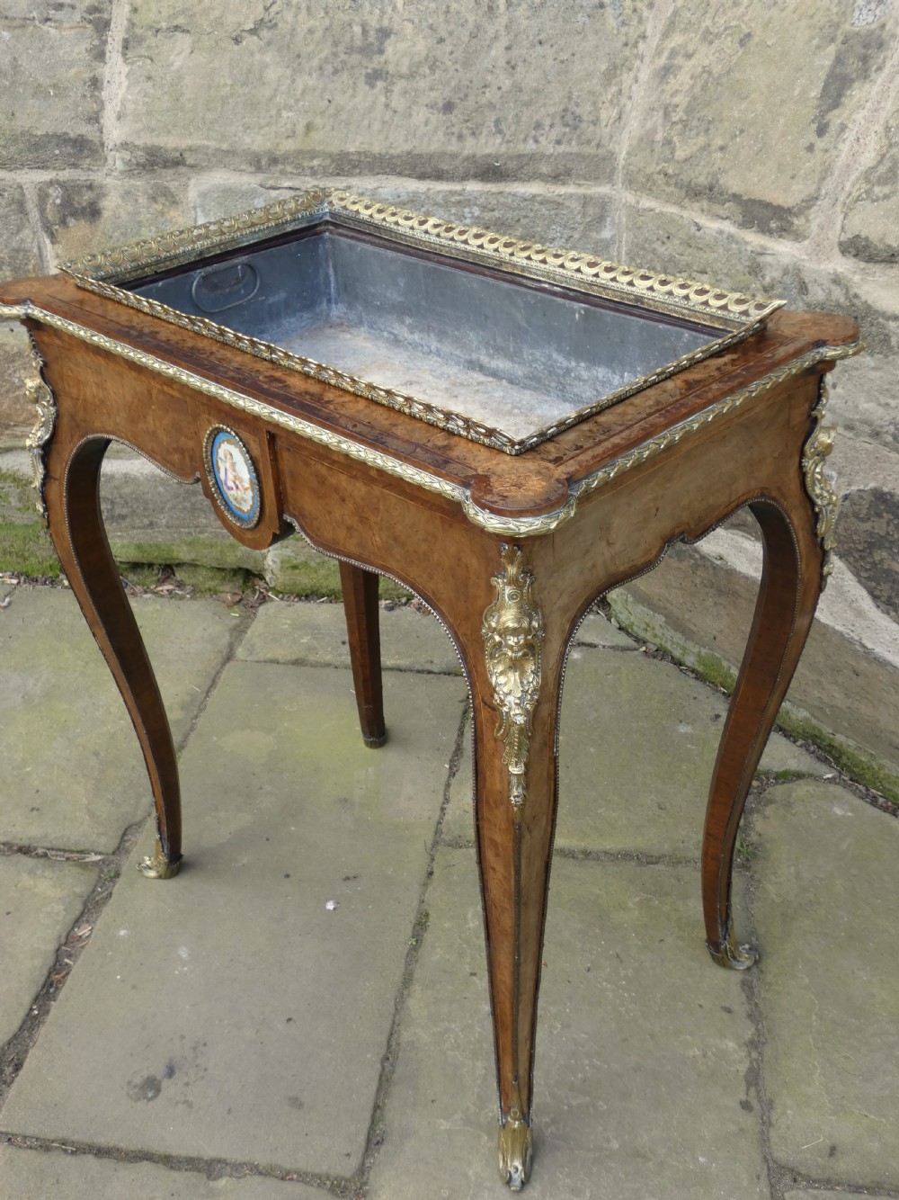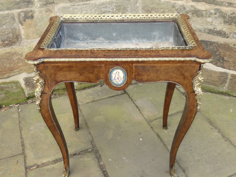 Lovely quality walnut jardinière with inlay detail and pierced brass gallery to the top and original lift out metal liner. Decorative Omalu edging throughout and cherub mounts to each corner, raised on elegant cabriole legs with Omalu sabots and wonderful Sevres style plaques to both sides.