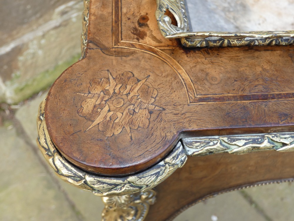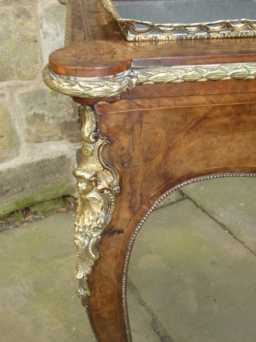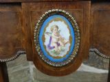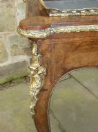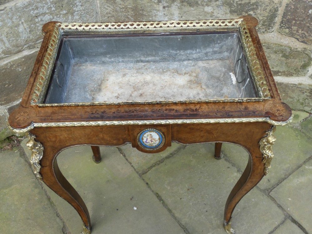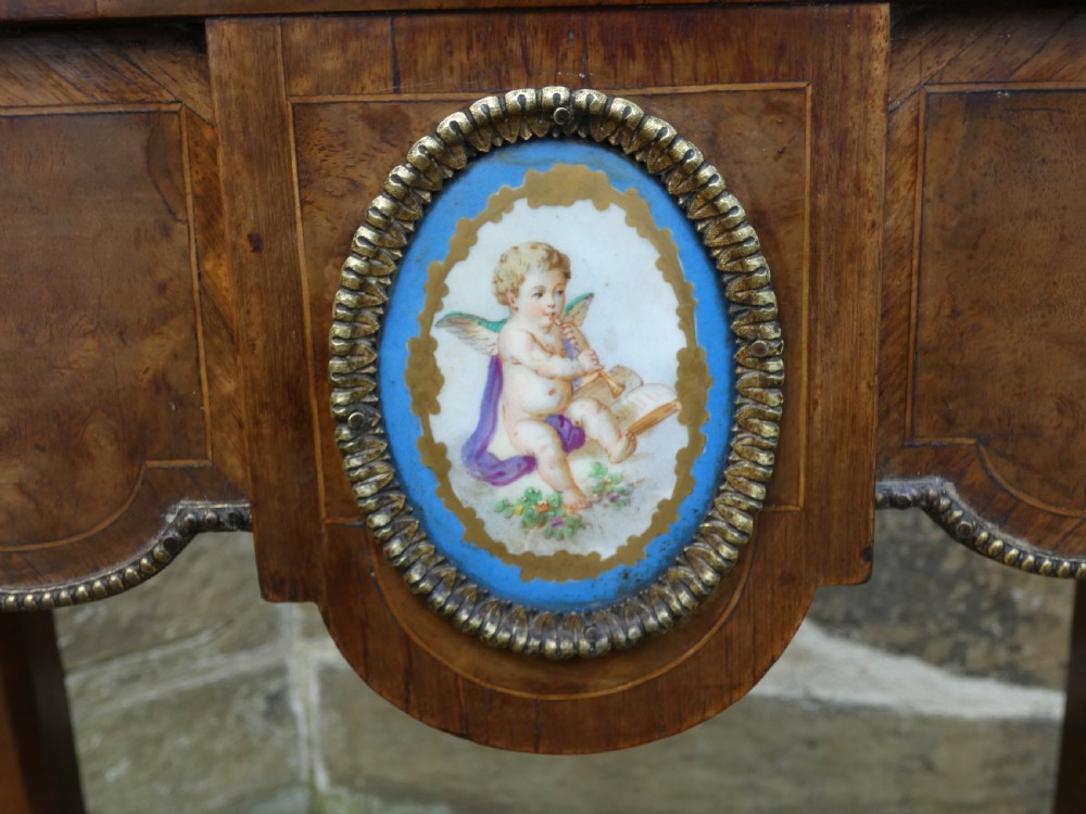 Lovely quality walnut jardinière with inlay detail and pierced brass gallery to the top and original lift out metal liner. Decorative Omalu edging throughout and cherub mounts to each corner, raised on elegant cabriole legs with Omalu sabots and wonderful Sevres style plaques to both sides.