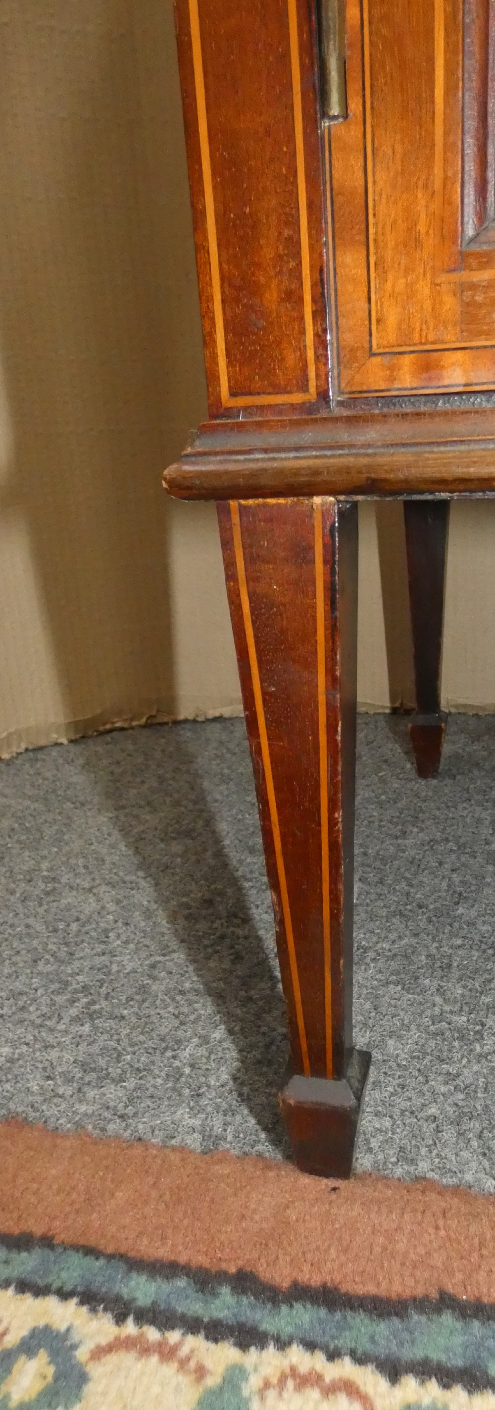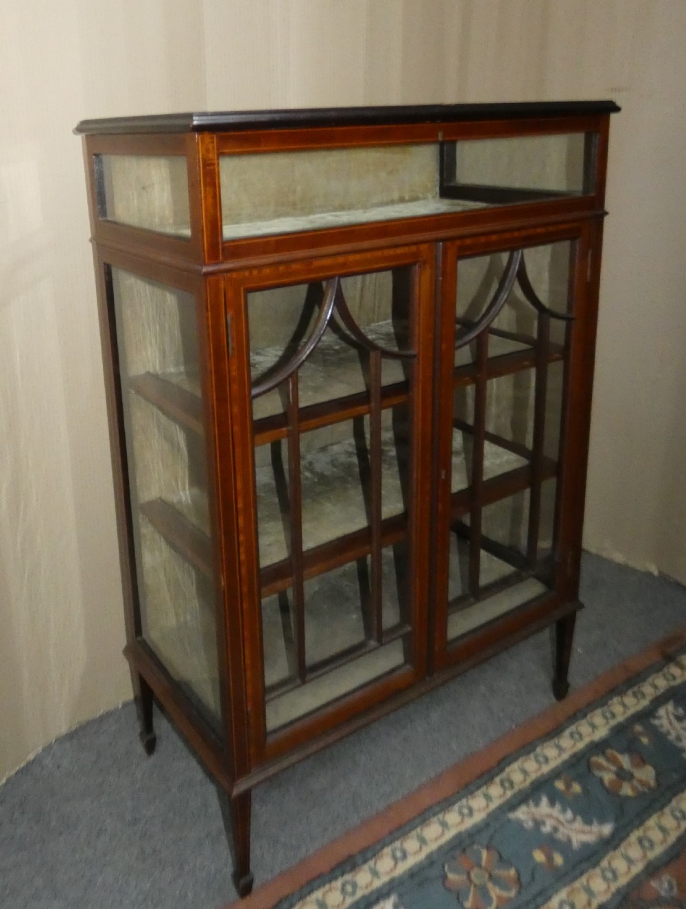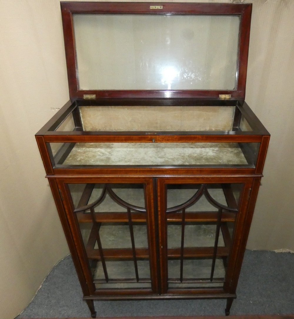 Good quality mahogany bijouterie cabinet with satinwood crossbanding and boxwood stringing inlay detail. The lift up lid ( working lock & key) opening to original velvet lined interior with two astragal glazed doors below ( working lock & key ) opening to shelved interior, again with the original velvet lining, raised on elegant square tapering legs with spade feet.