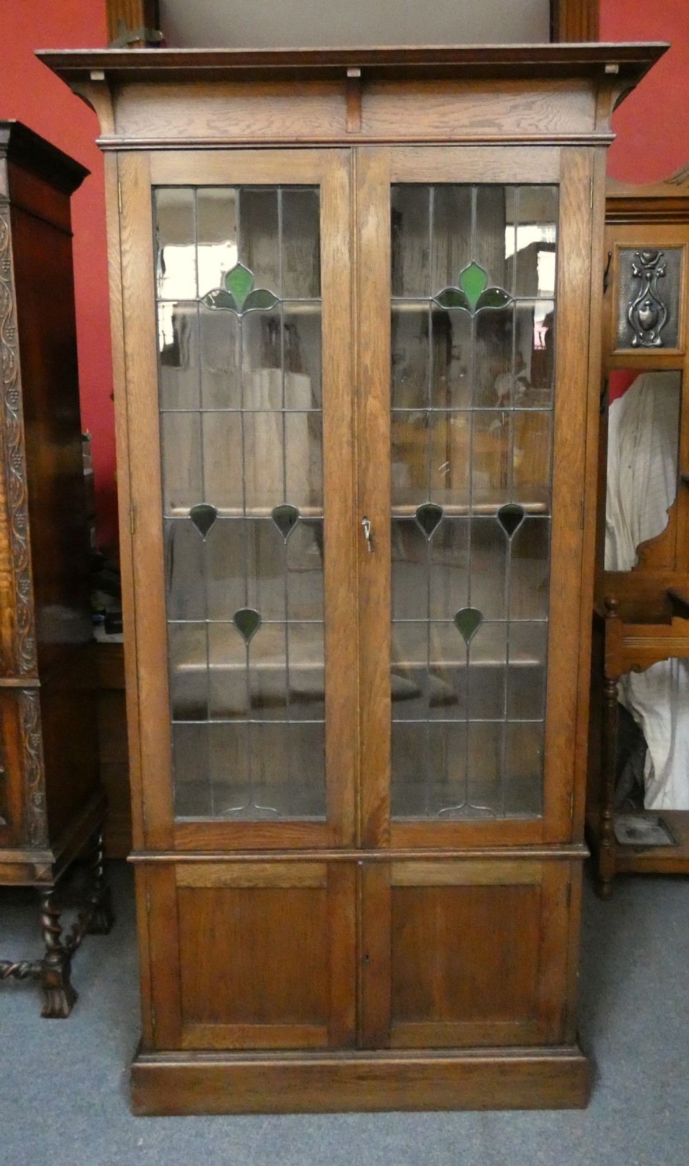 Charming oak Arts & Crafts bookcase... the top with flared cornice over attractive leaded glass doors ( working lock and key ) opening to adjustable shelved interior, a further pair of cupboard doors below, again with shelved interior.