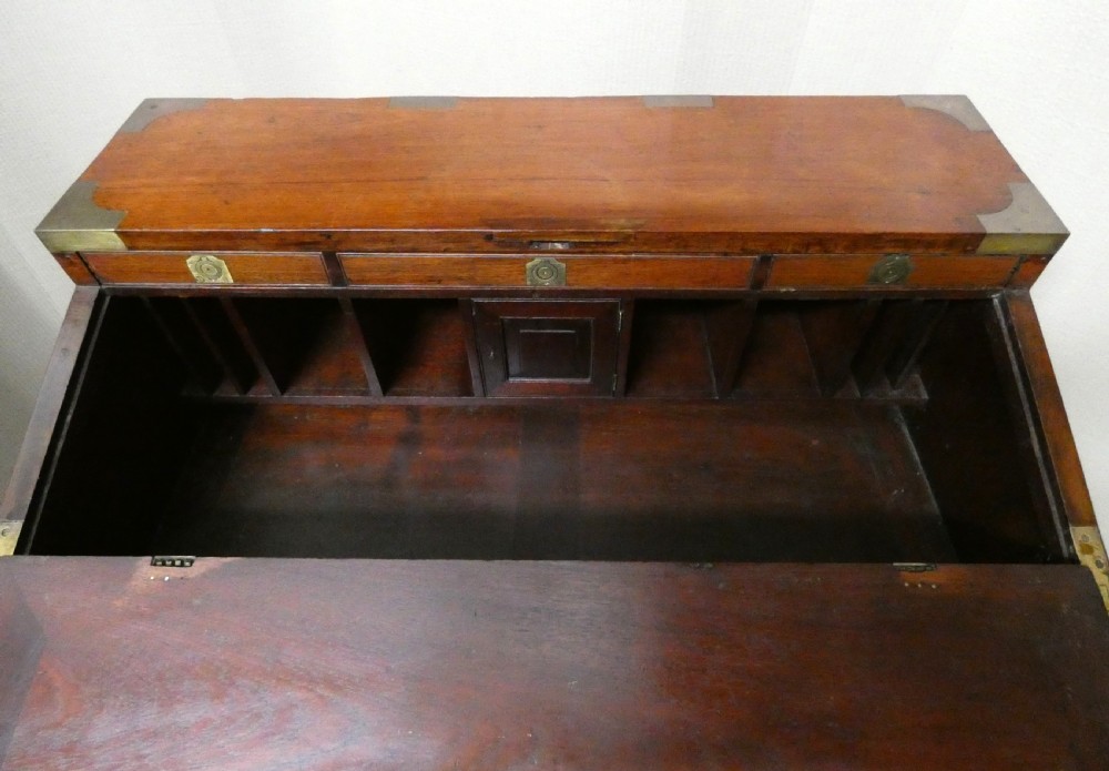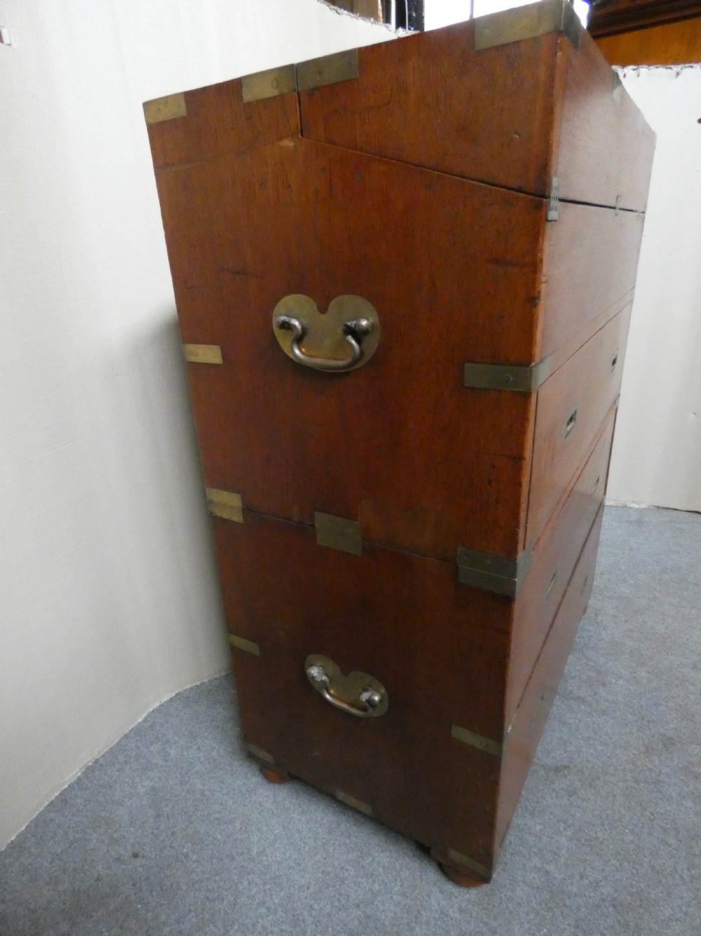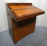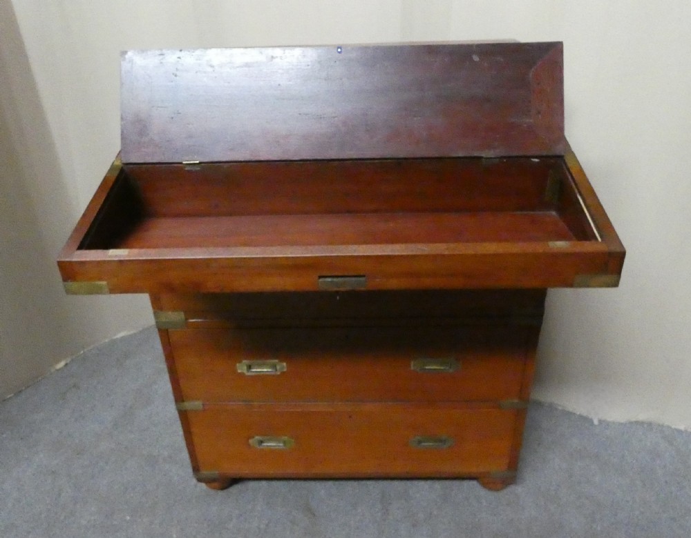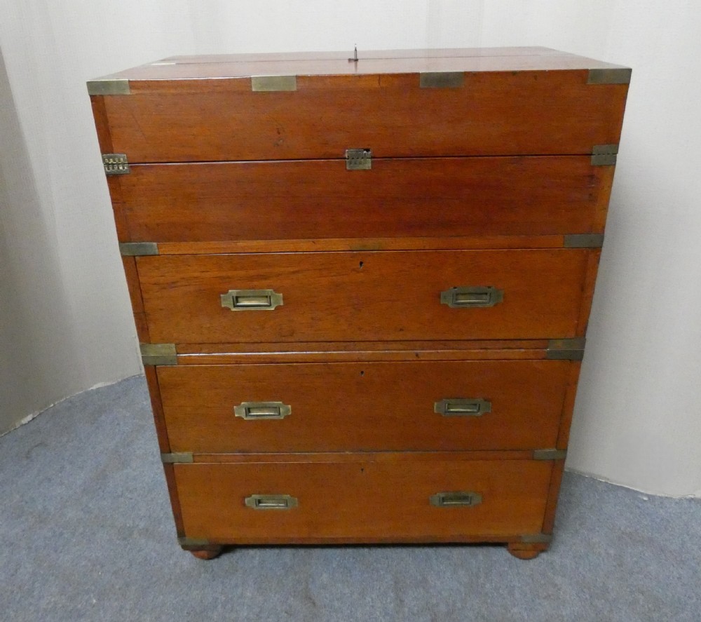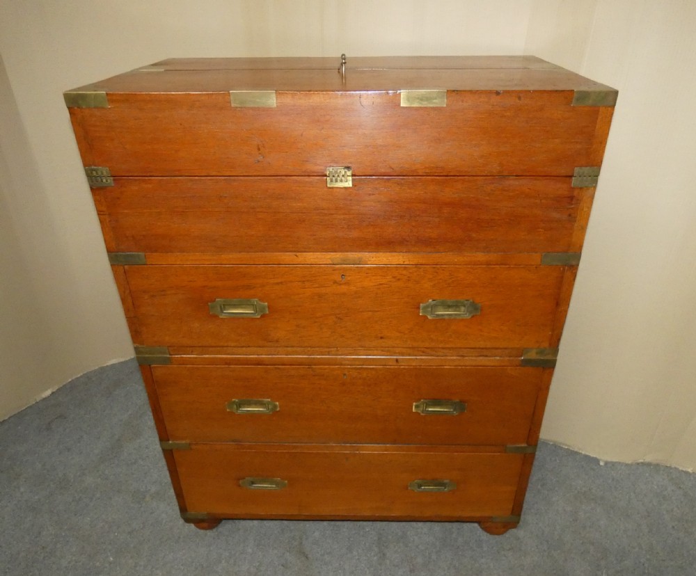 An unusual brass bound, two section, teak secretaire campaign chest.