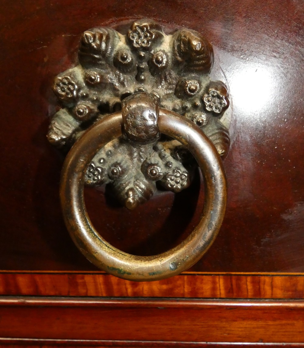 The flared cornice with inlay detail over a pair of crossbanded panelled doors enclosing two original pull out sliding trays. The base with three graduating, crossbanded drawers with substantial handles, shaped apron and raised on splay feet.