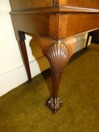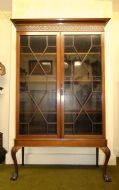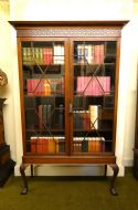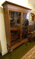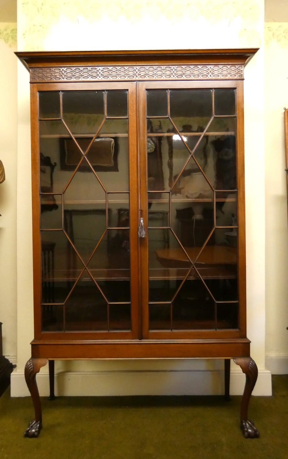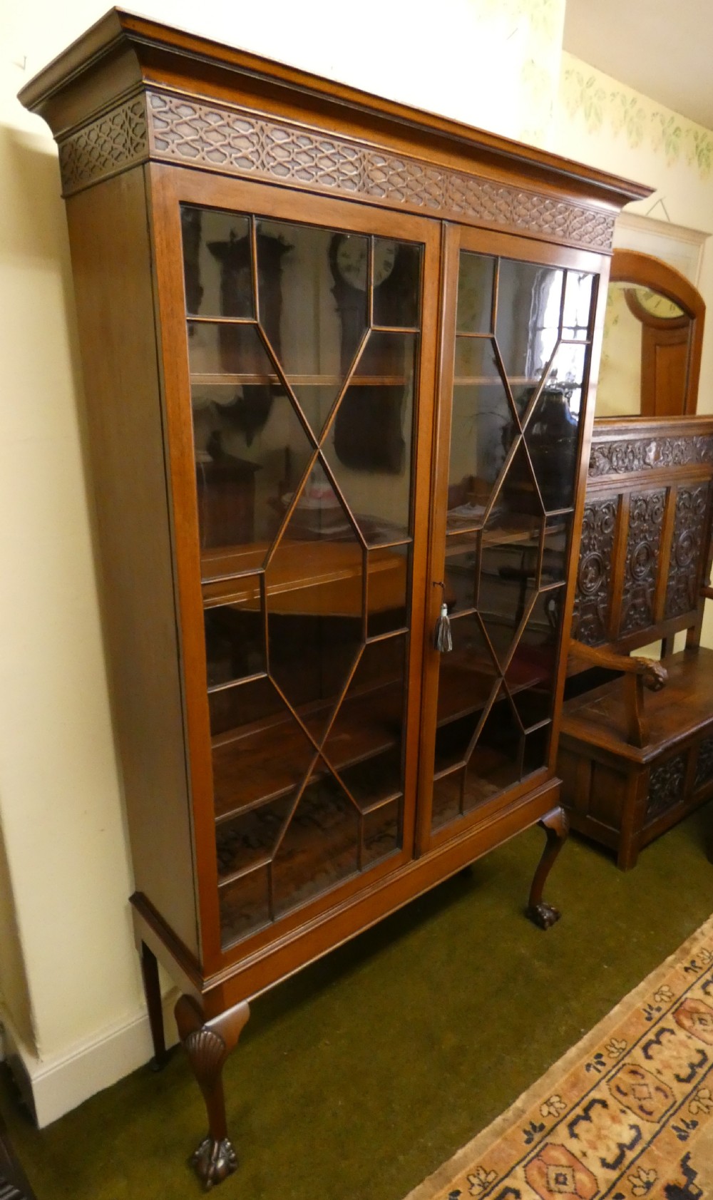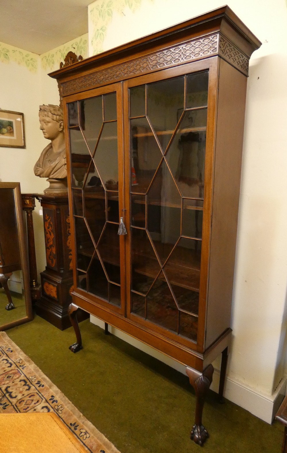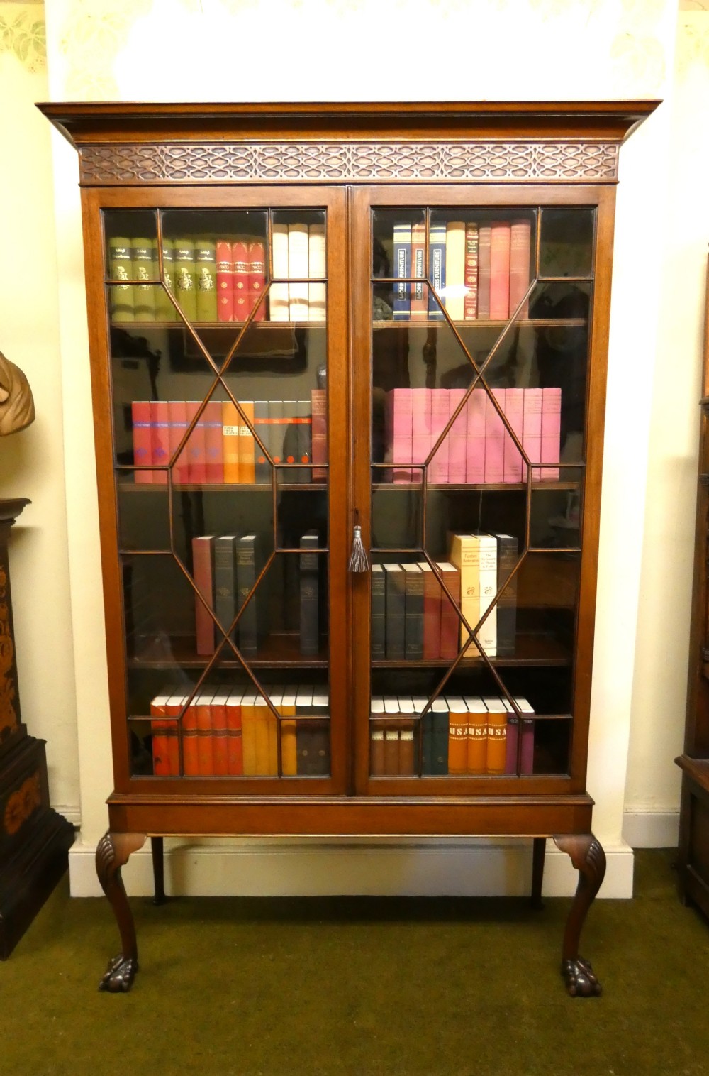 This elegant bookcase has a flared cornice with blind fret detail to the frieze, a pair of astragal glazed doors opening to an interior with adjustable shelves, raised on cabriole legs with carved shell details and substantial ball and claw feet.
