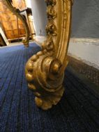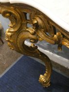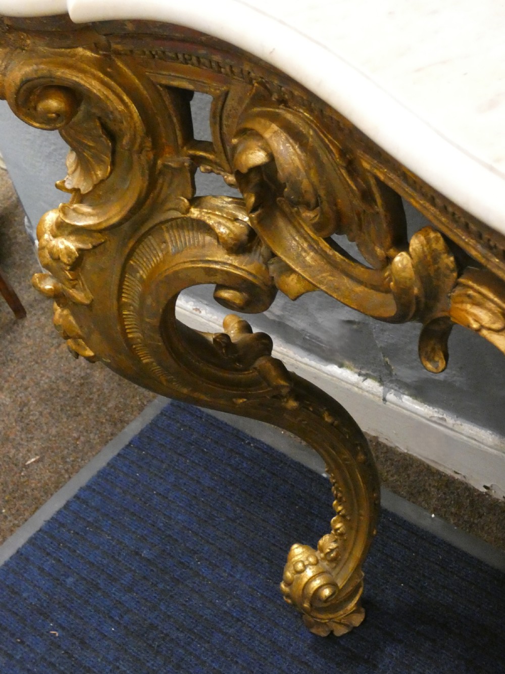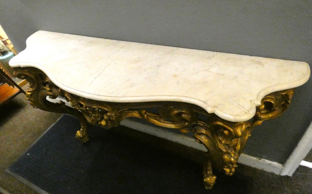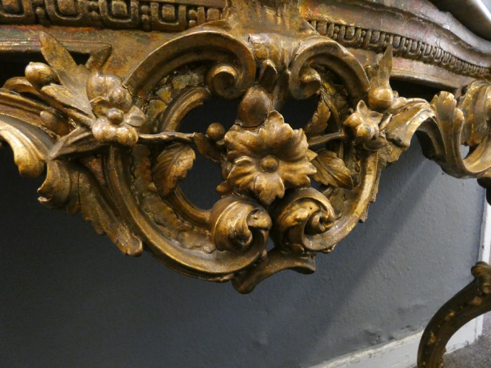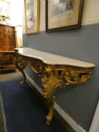 Very elegant large giltwood wall mounted console table with grey veined marble top, decorative carved pierced frieze and raised on substantial carved cabriole legs terminating in knurled feet.