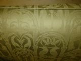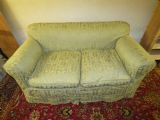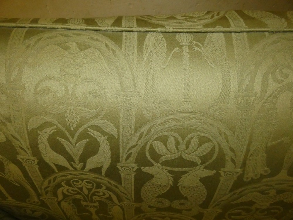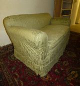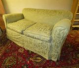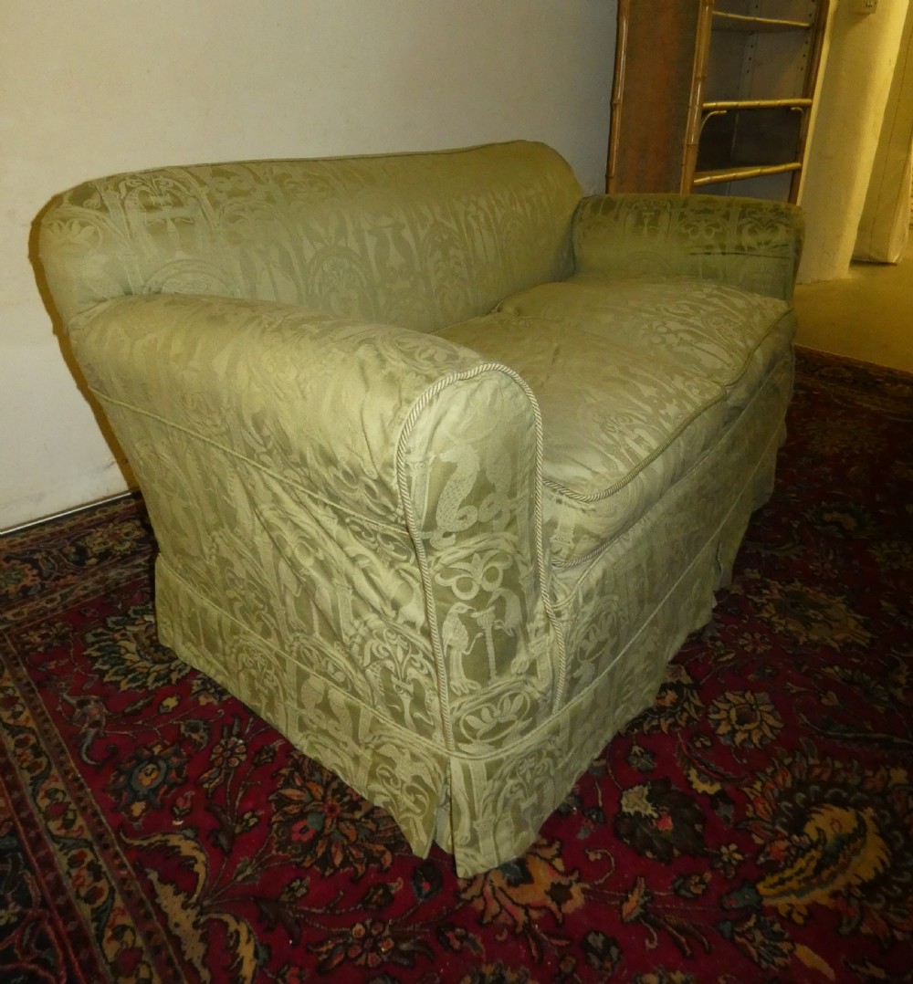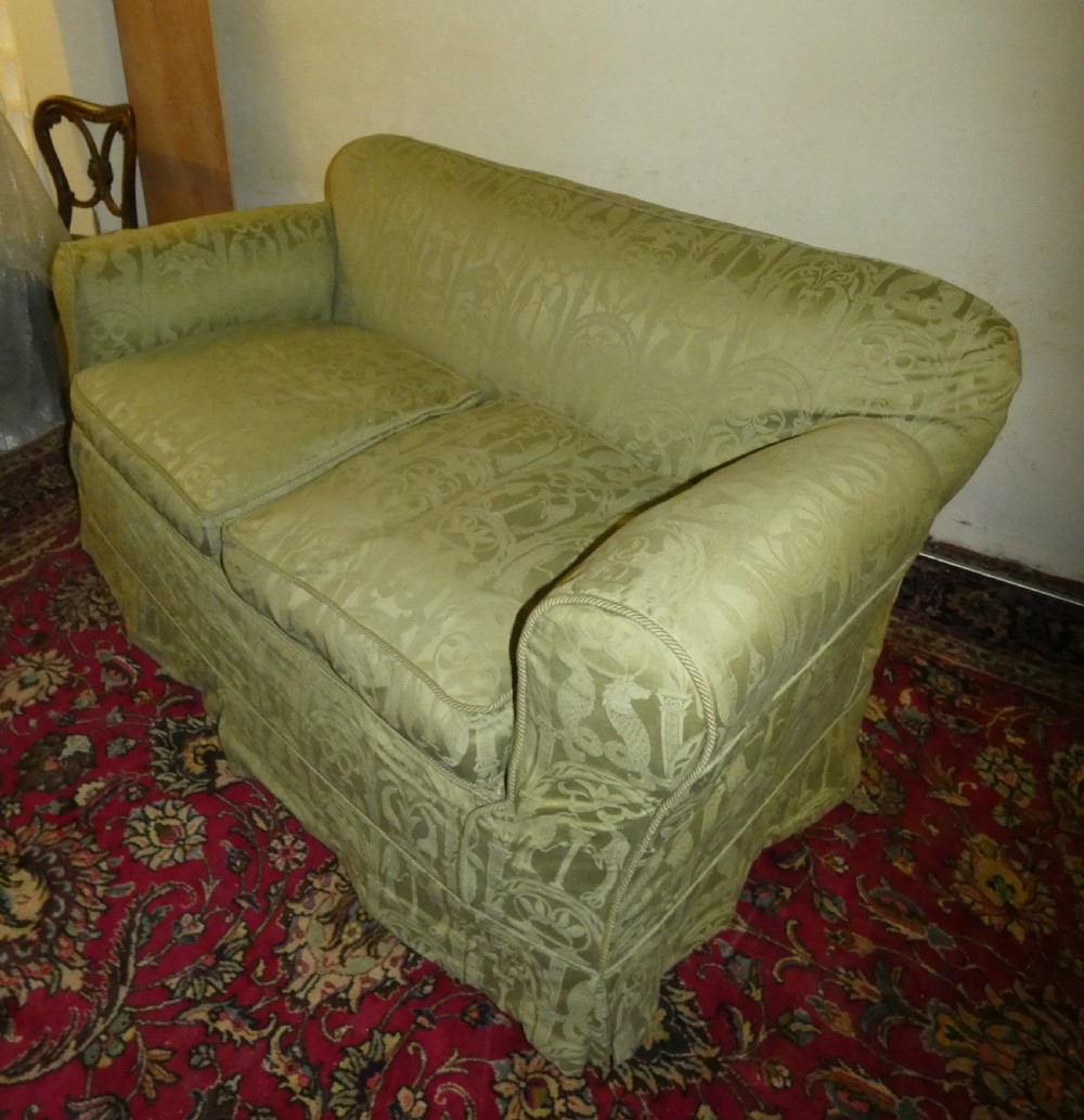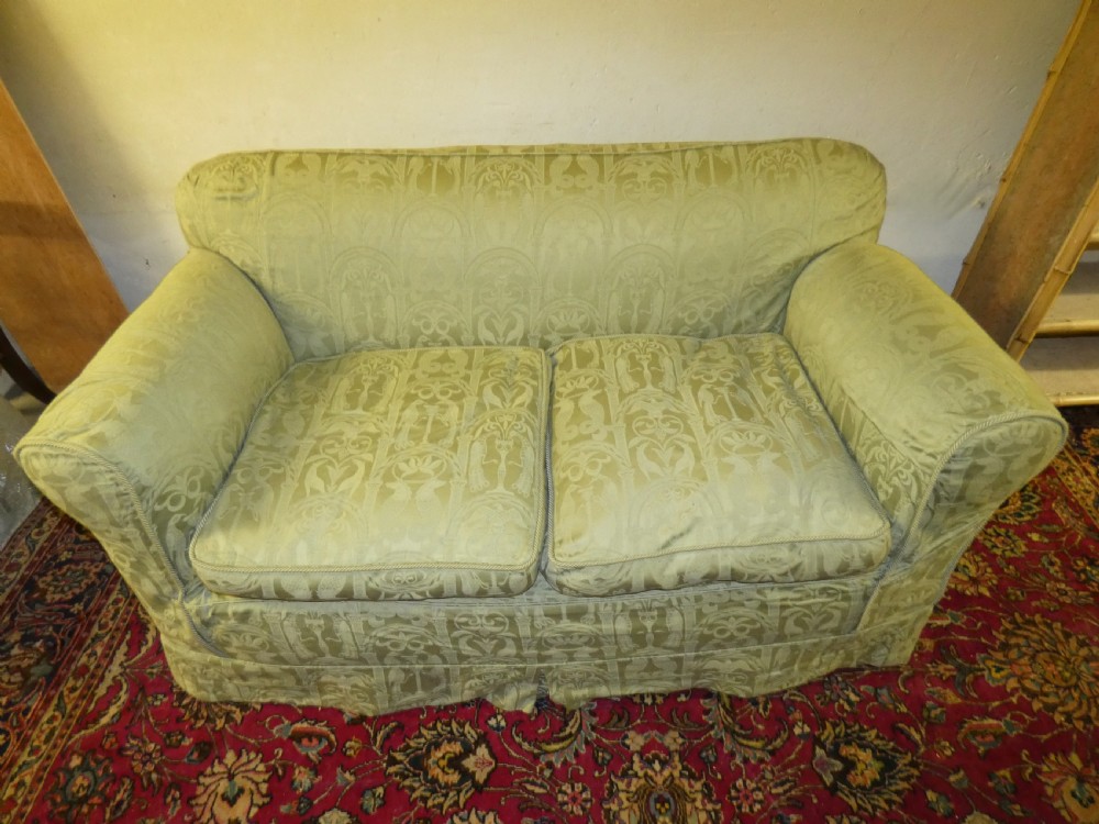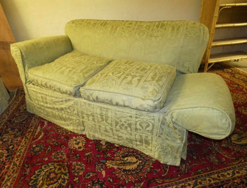 This lovely sofa has beautifully made loose covers in a heavy gold/green silk damask type fabric but still retains the original upholstery below, the feather cushions are extremely comfortable to sit on.