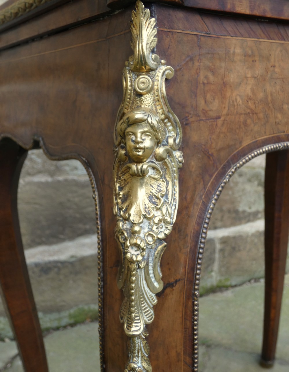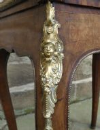 Lovely quality walnut jardinière with inlay detail and pierced brass gallery to the top and original lift out metal liner. Decorative Omalu edging throughout and cherub mounts to each corner, raised on elegant cabriole legs with Omalu sabots and wonderful Sevres style plaques to both sides.