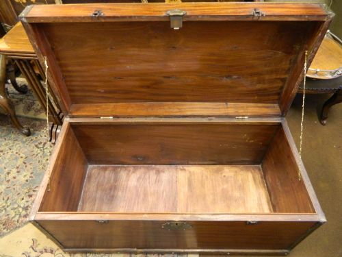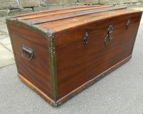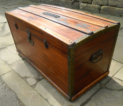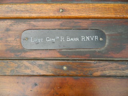 interesting brass bound teak captains trunk with handles to the sides and name plaque for Lieut. Com.dr R Barr, RNVR.