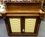 the galleried shelf with turned supports over base fitted with frieze drawer and decorative scroll mouldings, the wonderful brass grille door fronts lined with pleated silk open to shelved interior, standing on bun feet.