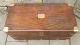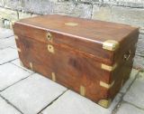 handsome camphor wood trunk with brass bindings, campaign style recessed brass handle to the front and substantial brass carrying handles to the sides, the lid with brass cartouche opening to very clean interior with the wonderfully distinctive camphor aroma.