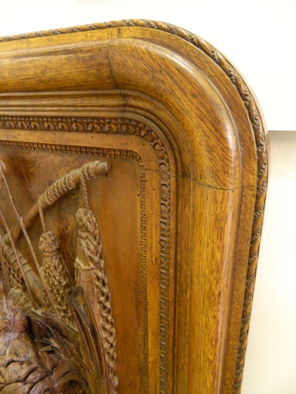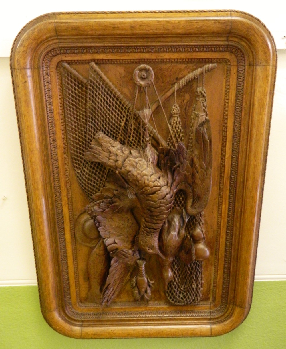 very decorative large oak wall plaque with intricately detailed relief carved birds, fish, nets etc.