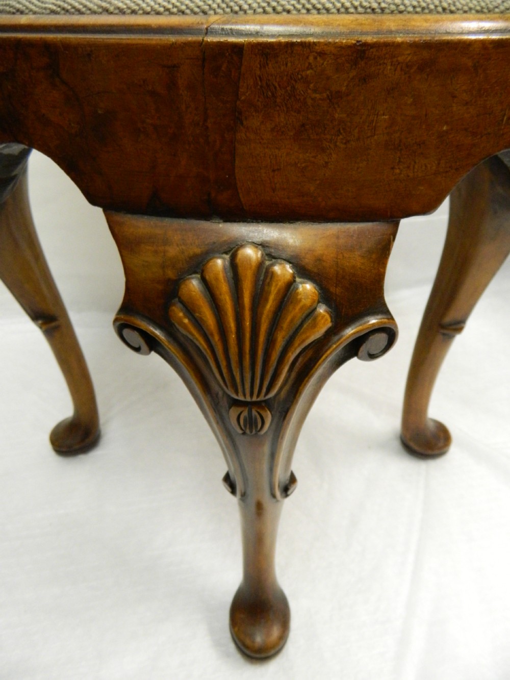 very elegant walnut oval stool with original floral tapestry seat and standing on shell carved cabriole legs.