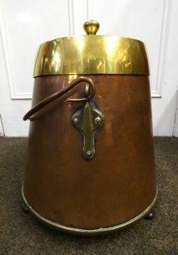 lovely large copper jardiniere / log bin with decorative lions mask ring handles and rivet detail, standing on three paw feet.