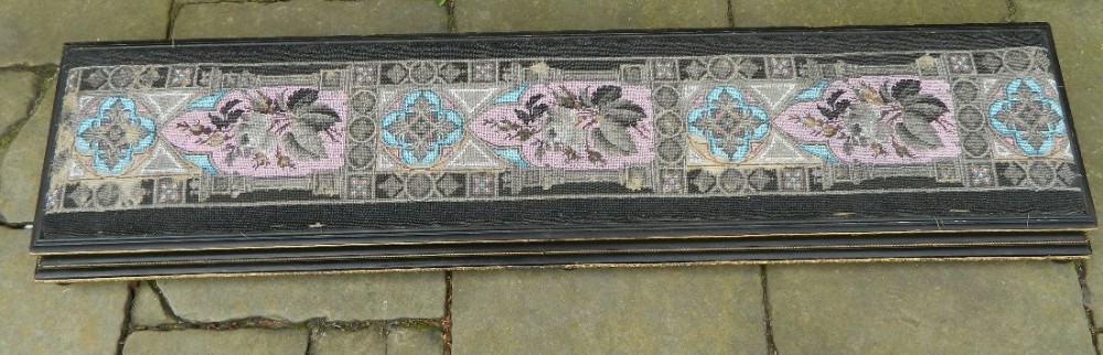 charming long Victorian fender stool with decorative bead work top in an ebonised frame with gilt metal mounts, raised on bun feet.