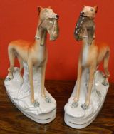 super pair of tall Staffordshire pottery greyhounds, both with rabbits / hares in their mouths.