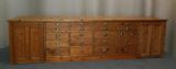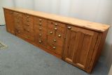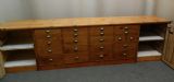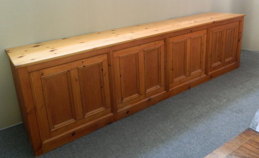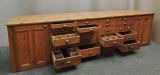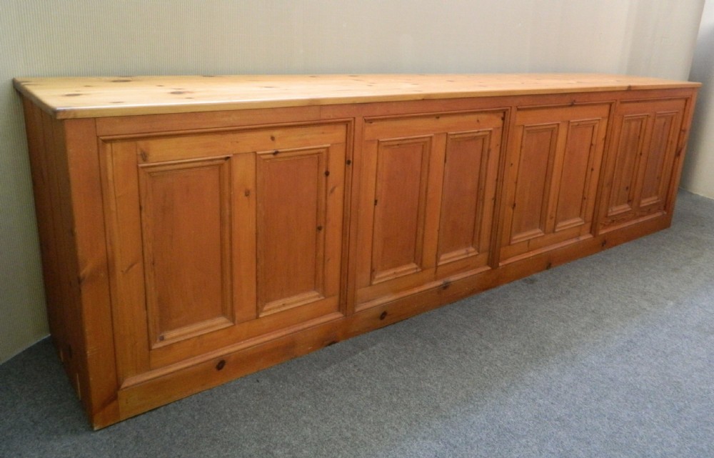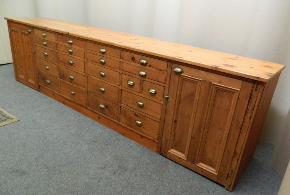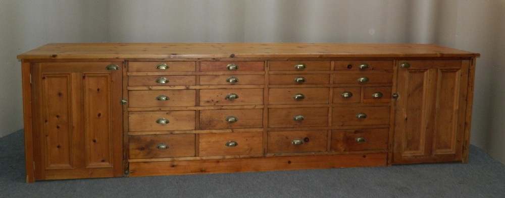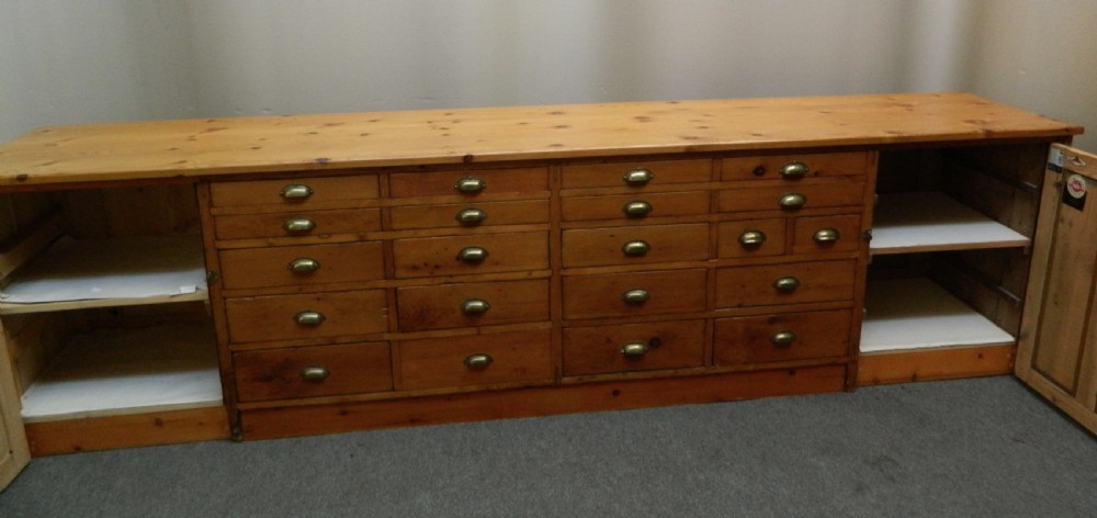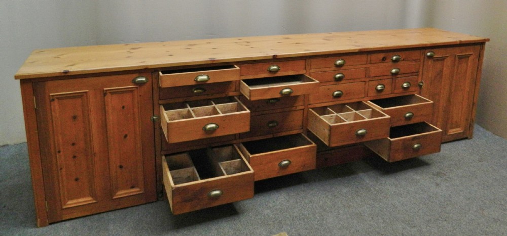 fabulous large pine shop counter with an array of 21 drawers of varying sizes and large shelved cupboards to either end, the other side is full panelled.
