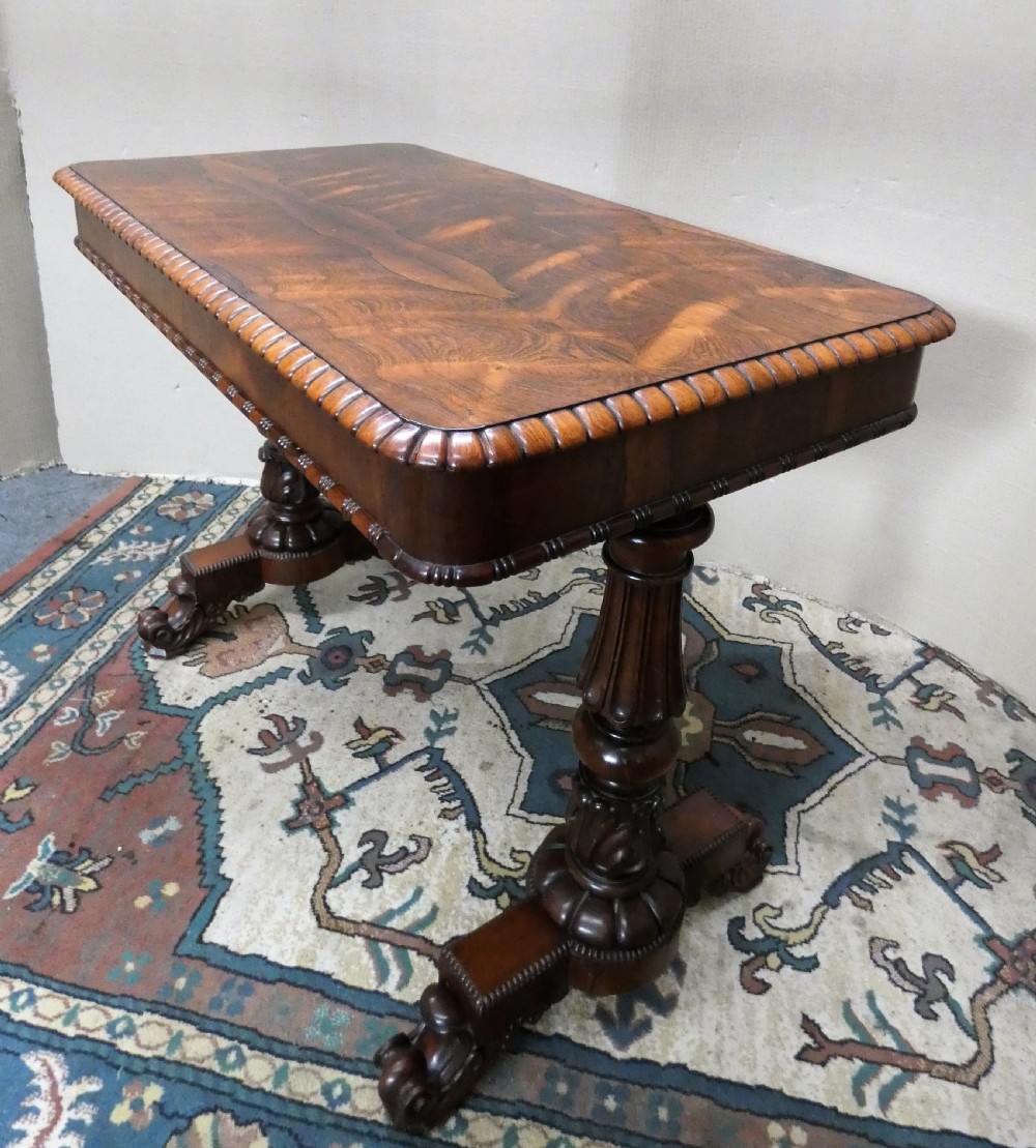 good quality William IV library table in beautifully figured rosewood, the moulded edge top has two frieze drawers and is raised on handsome turned and carved supports on platform base with carved scroll feet fitted with castors.